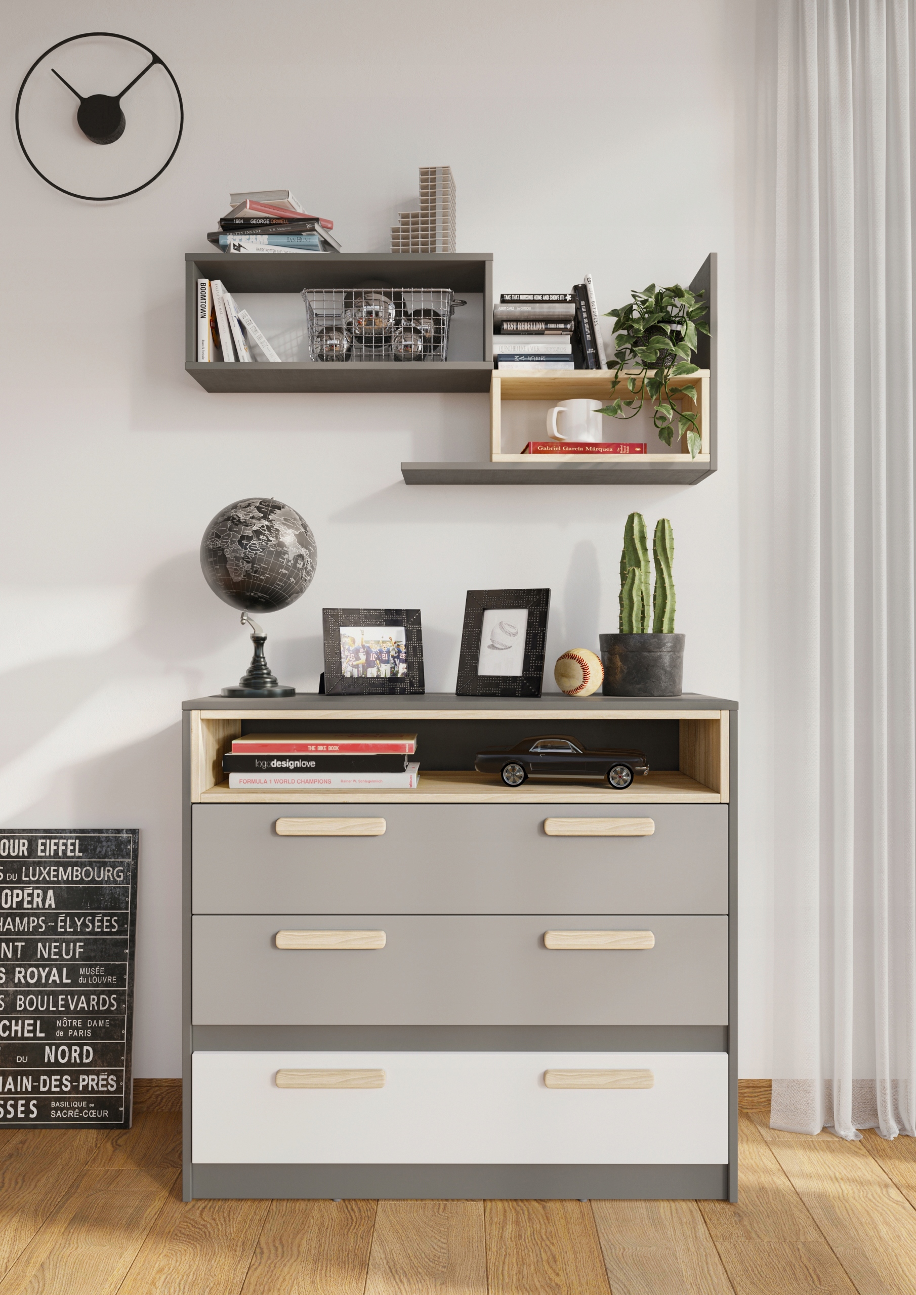 Комод оснащен тремя глубокими и очень вместительными ящиками и открытой, легкодоступной полкой.