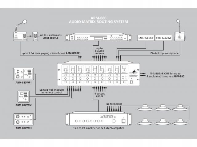 Матрица ARM-880 имеет 8 зонных выходов для подключения усилителей или комплектов активных громкоговорителей.