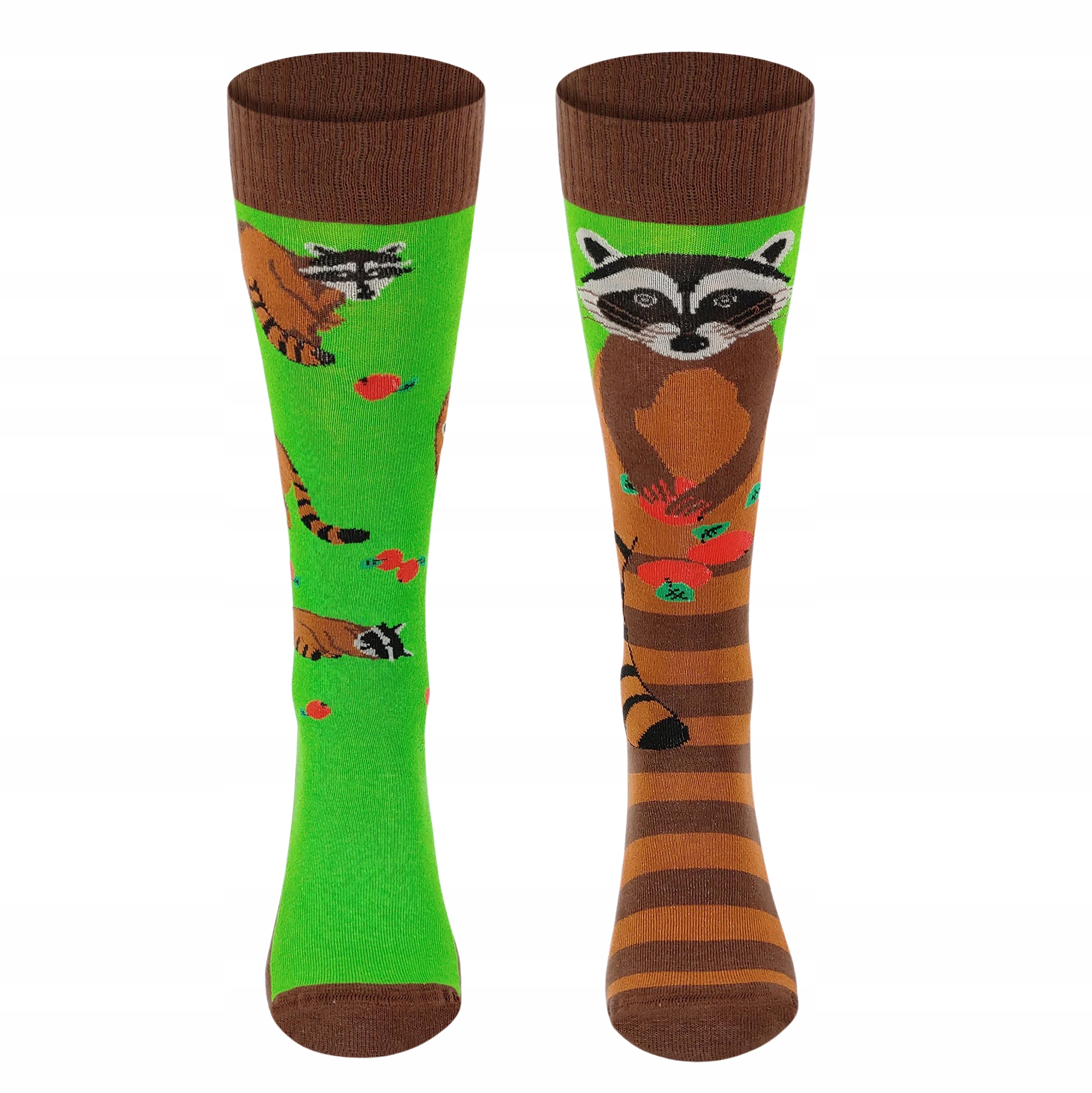 Смешные носки в ярко -зеленом цвете, украшенное енотом мотива и красными яблоками - отличный способ добавить цвет в любой наряд. Из -за подкрепления на пятках и пальцах они обеспечивают комфорт и долговечность. Гибкий Welt держит носки на месте, и их веселый дизайн делает их идеальными для всех, кто ценит оригинальность и природу в своем стиле.