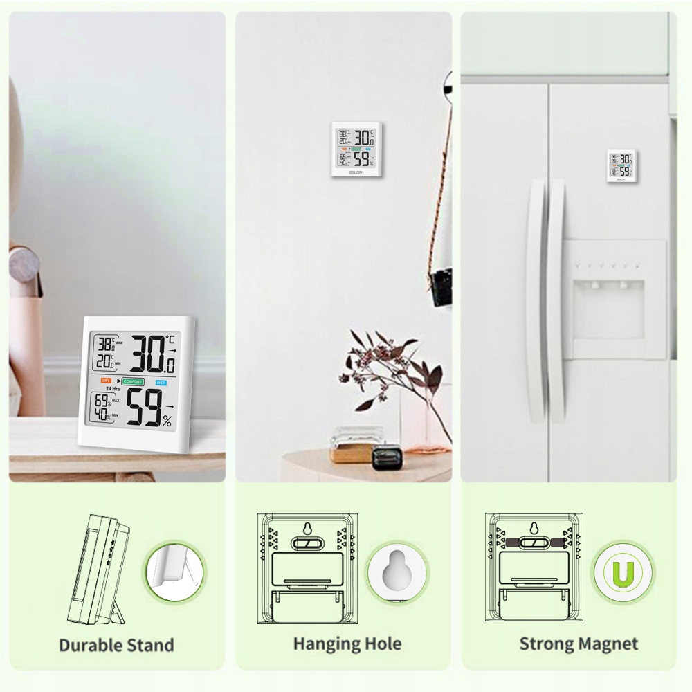 Благодаря практичному магниту сзади, настольной подставке и подвесному кронштейну датчик можно легко установить/ крепится к различным поверхностям в зависимости от ваших потребностей.