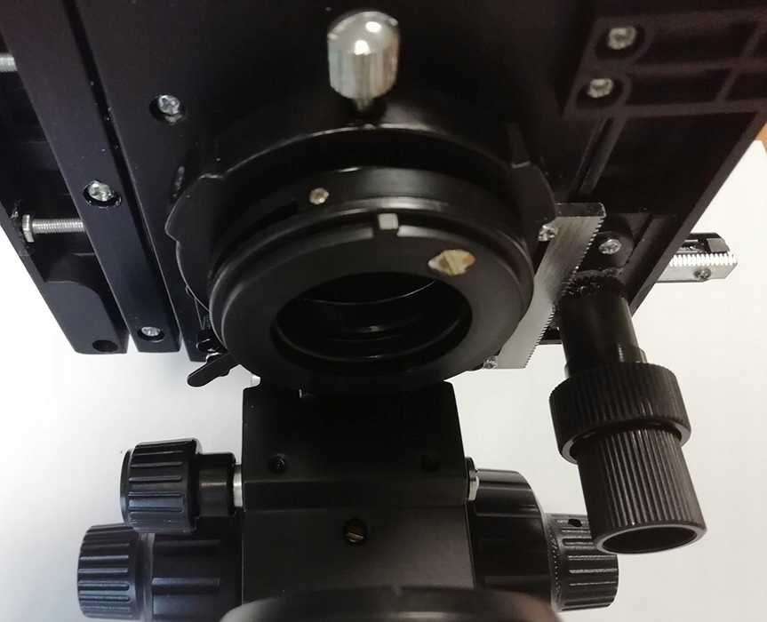 <р> - предметный столик (110мм х 125мм) <р> - двухслойная перекрестная таблица <р> - Светодиодный осветитель <р> - плавная регулировка интенсивности освещения <р> - Конденсатор Аббе NA 1,25 с регулировкой по высоте <р> - ирисовая диафрагма <р> - держатель фильтра <р> - система грубой и точной фокусировки со шкалой (коаксиальная) <р> - адаптер переменного тока <р> - батарейный отсек интегрирован в основание.Также оснащено:
