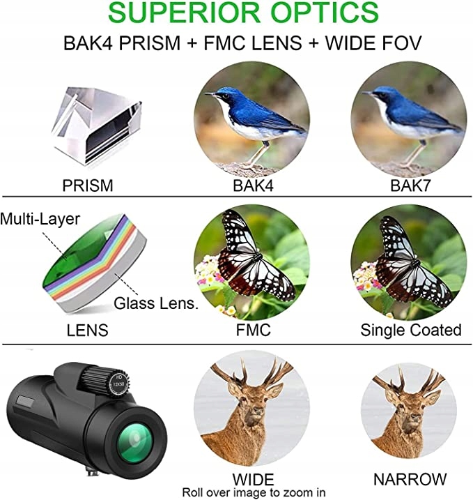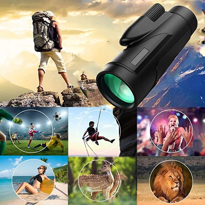 Монокулярный телескопс высокой -качественная оптика, призма BAK-4 и линза FMC, коэффициент пропускания света достигает 99,5%, обеспечивает больше света в поле зрения, уменьшает хроматическую аберрацию и двоение изображения, обеспечивает четкость, яркое и более красочное зрение на расстоянии до 1000 метров.