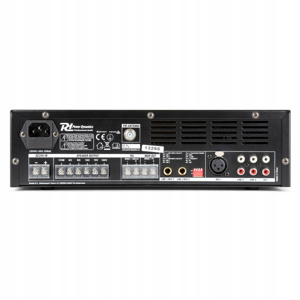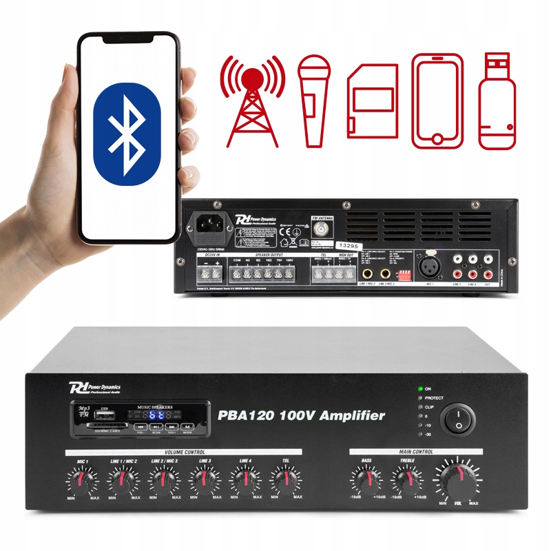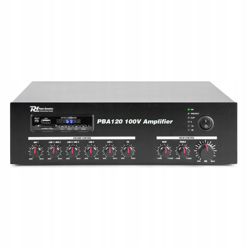 Power Dynamics PBA120 — мощный усилитель 100 В мощностью 120 Вт. Он оснащен MP3-плеером, тюнером, Bluetooth и несколькими линейными и микрофонными входами, поэтому с этим усилителем можно использовать практически все источники звука. Для правильной настройки звука он оснащен регуляторами низких и высоких частот, а каждый вход имеет собственный регулятор громкости.