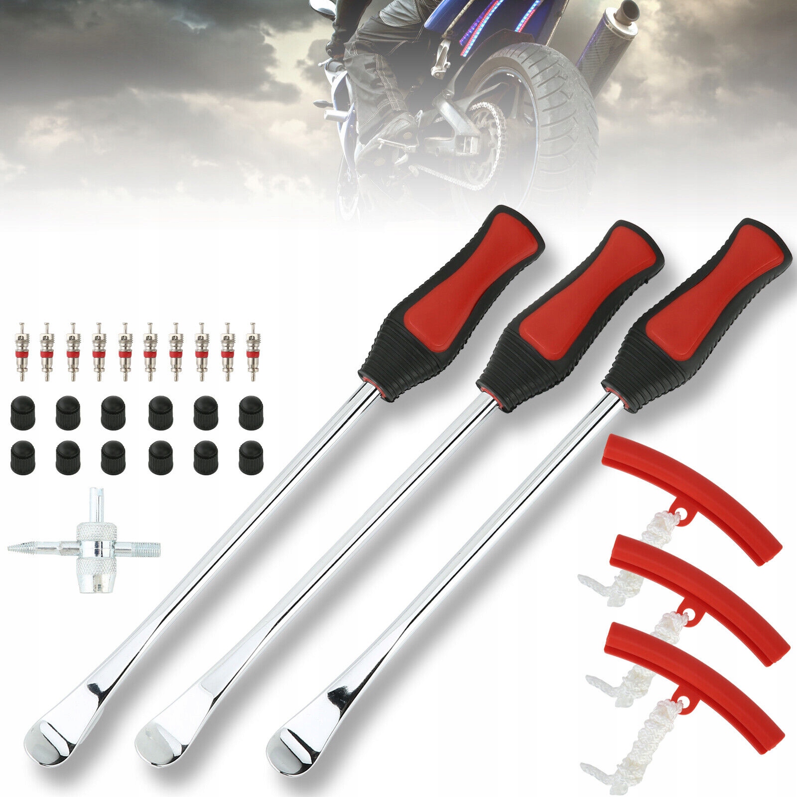 - Упаковка: в комплект входят 3 рычага для шин, 3 защитных приспособления для шин, 1 инструмент для четырехходового клапана, 10 сердечников вентилей для шин, чтобы заменить ваш идеальный инструмент для шин.
