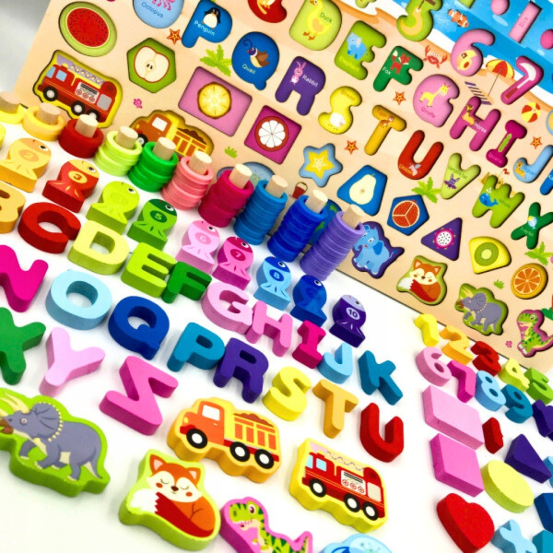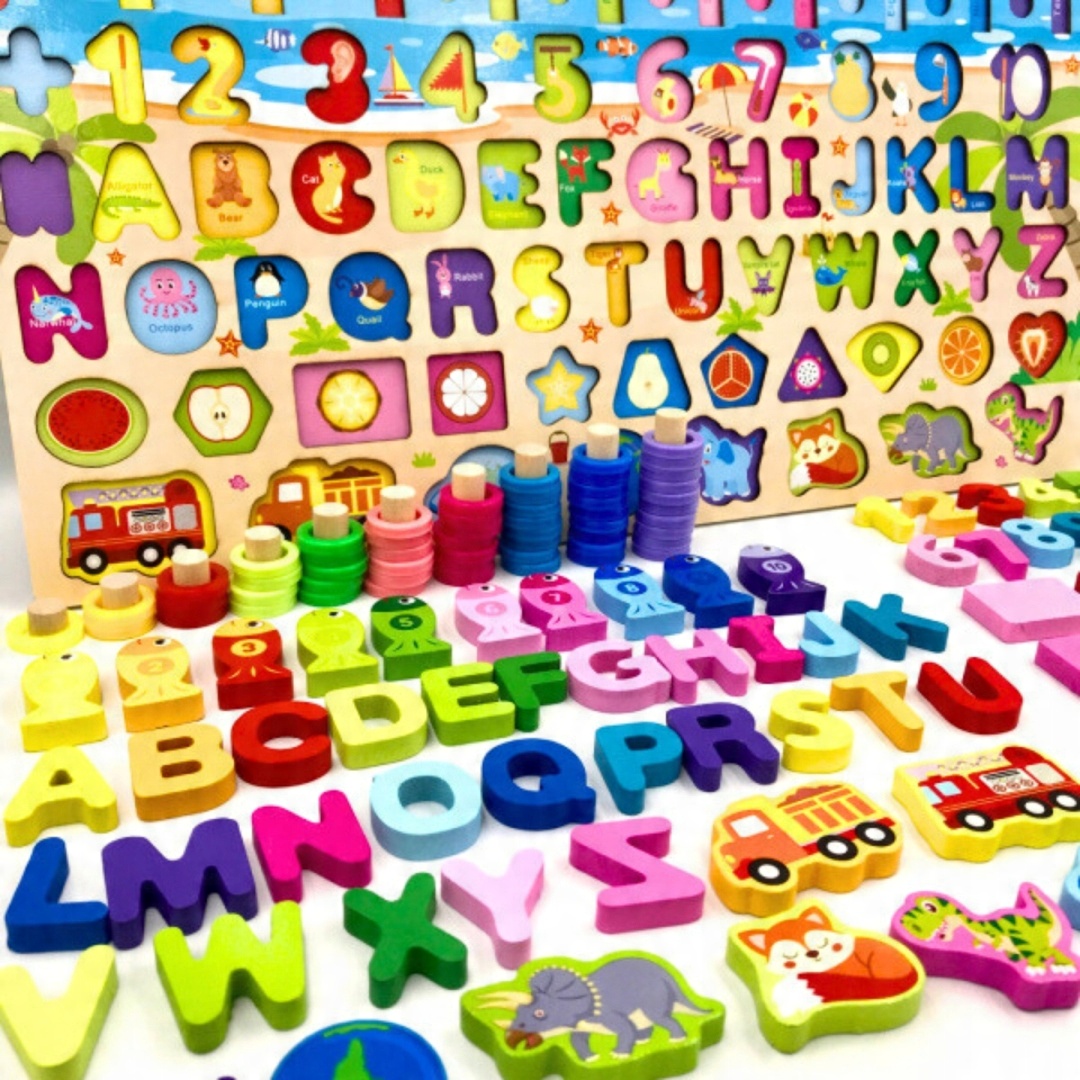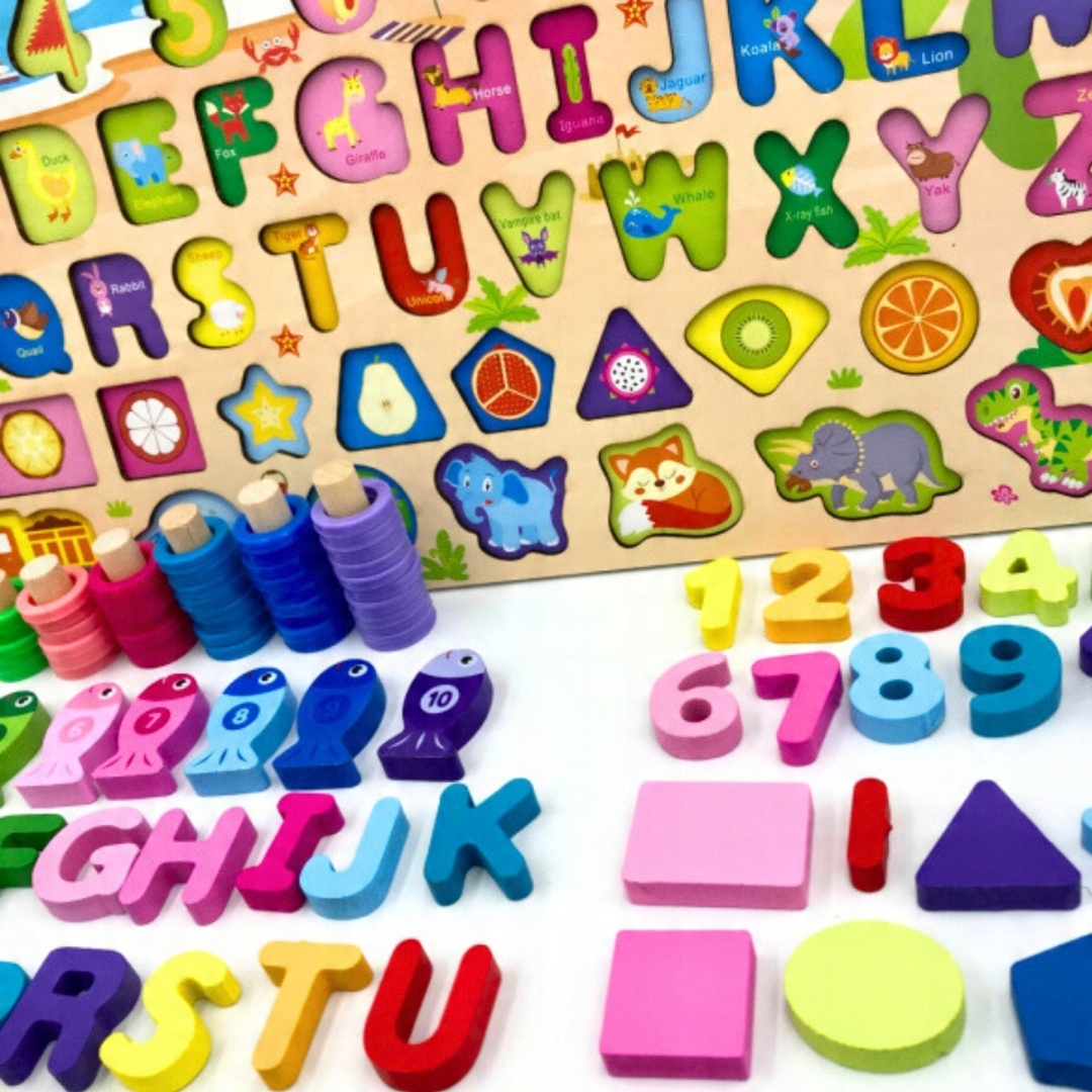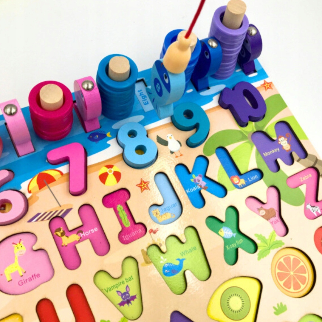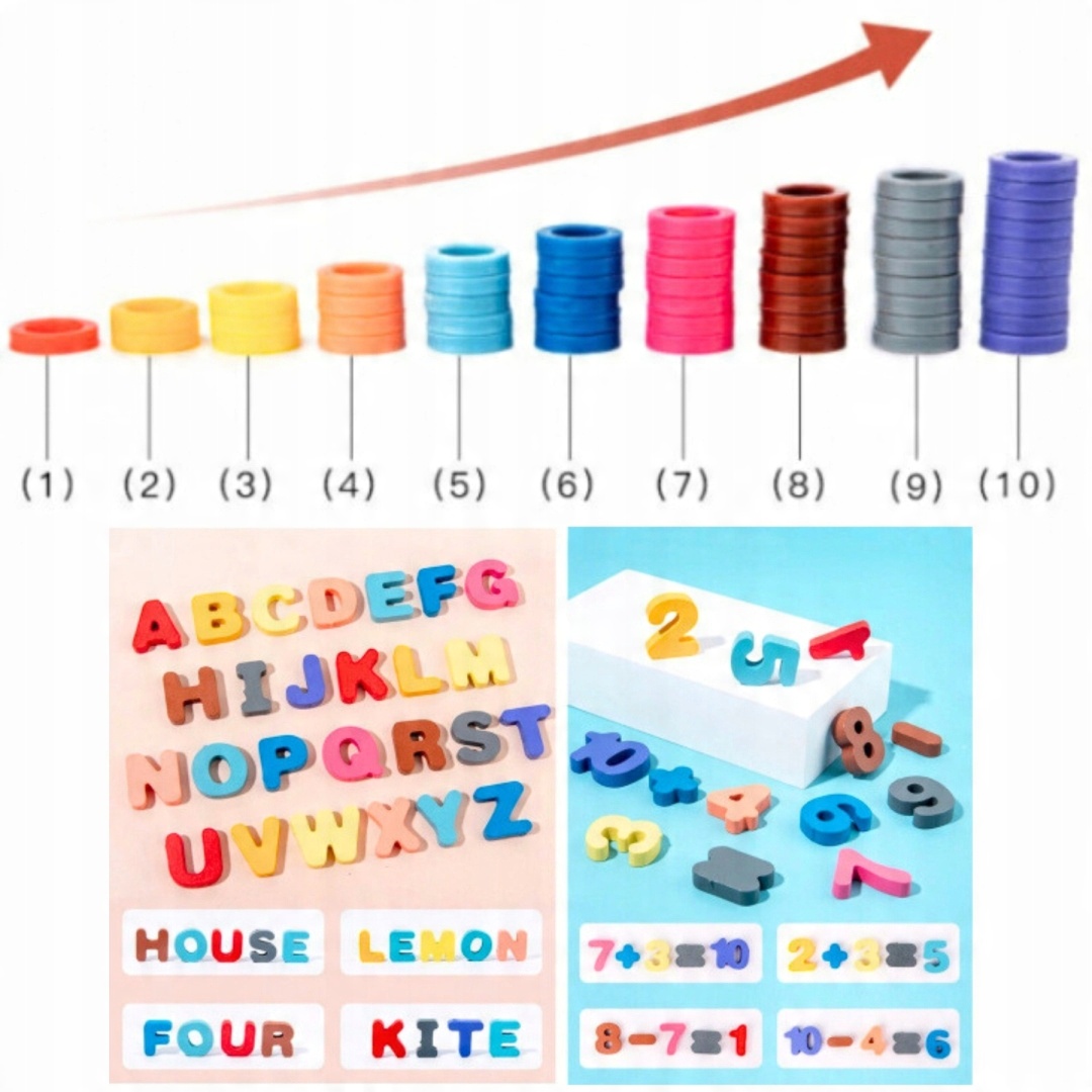 Основы математики через игру. В набор также входит полноценный алфавит из деревянных букв, благодаря которому будет легче выучить первые слова.