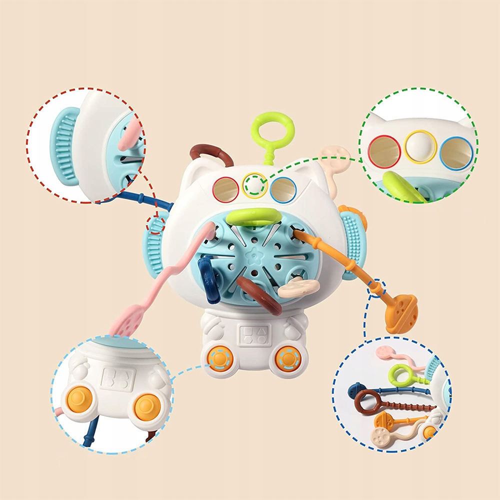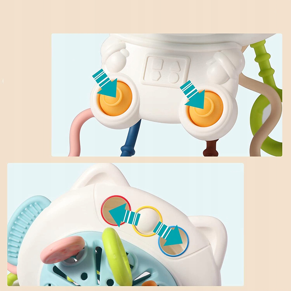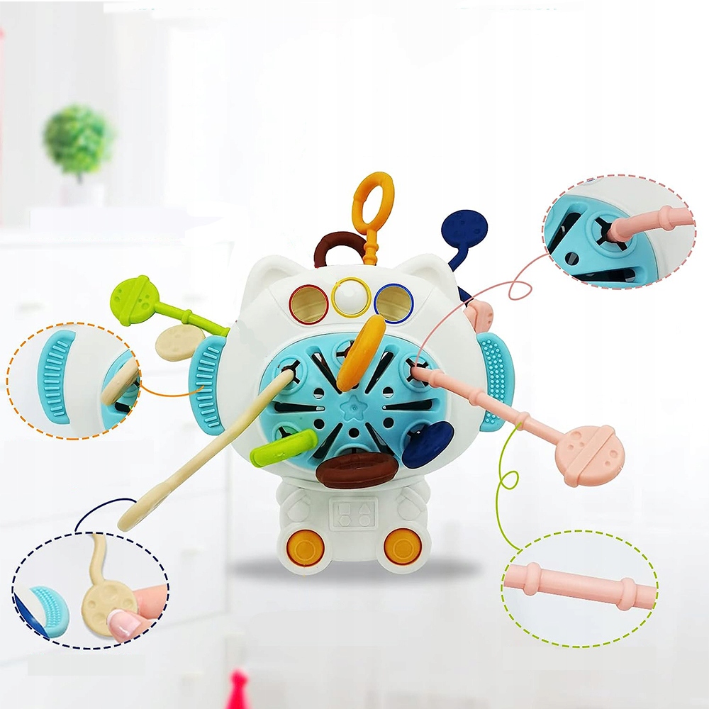 - 🎉 -【Сенсорная игрушка】 -Игрушка Монтессори для детей от 1 года выполнена в форме космического кота и имеет 6 ниточек разной фактуры и цвета. Касаясь и тянув каждый провод из стороны в сторону с разной силой, малыши слышат разные звуки и чувствуют вибрации. Обе стороны развивающей игрушки имеют нескользящую ручку, благодаря которой дети могут держать ее.
