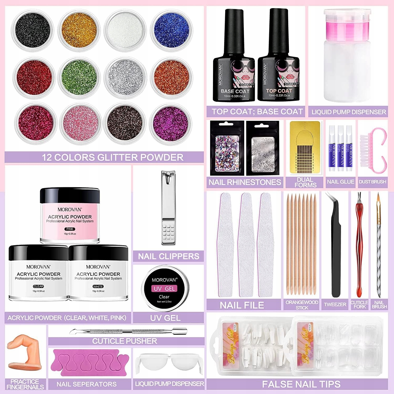 Профессиональный набор ногтей в акриловом порошке содержит все, что вам нужно для создания удивительных акрилических ногтей. 3 цвета акрилового порошка, мономерная моровановая акриловая жидкость для ногтей, 12 цветов блеска, внешний слой, искусственные кончики, упражнения для ногтей, стразы для ногтей и другие основные украшения ногтей. Идеально идеально подходит как для профессионального стилиста ногтей, так и любителей независимых начинающих акриловых ногтей.