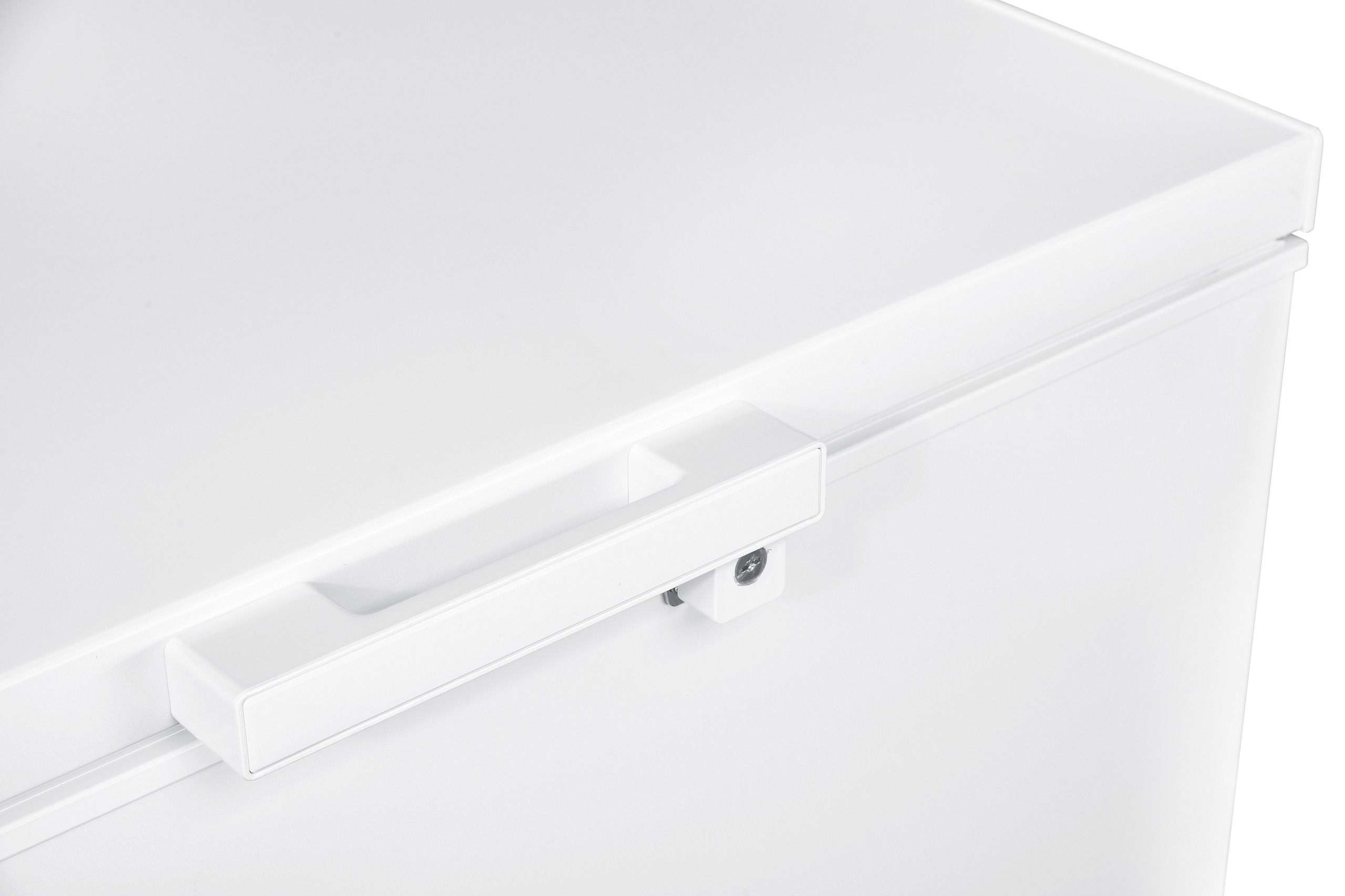 Морозильный ларь идеально подходит для длительного хранения большого количества замороженных продуктов. Его мощность составляет 287 литров. Он практичен, экономичен (класс энергопотребления F), прост в использовании и функционален. Интуитивно понятная панель управления позволяет легко установить желаемую мощность замораживания. Открытие и закрытие крышки устройства облегчается практичной встроенной ручкой специального профиля с замком с ключом рядом с ней. В морозильной камере имеется отверстие для слива воды при разморозке устройства. Функция быстрой заморозки позволяет быстро снизить температуру внутри морозильной камеры.