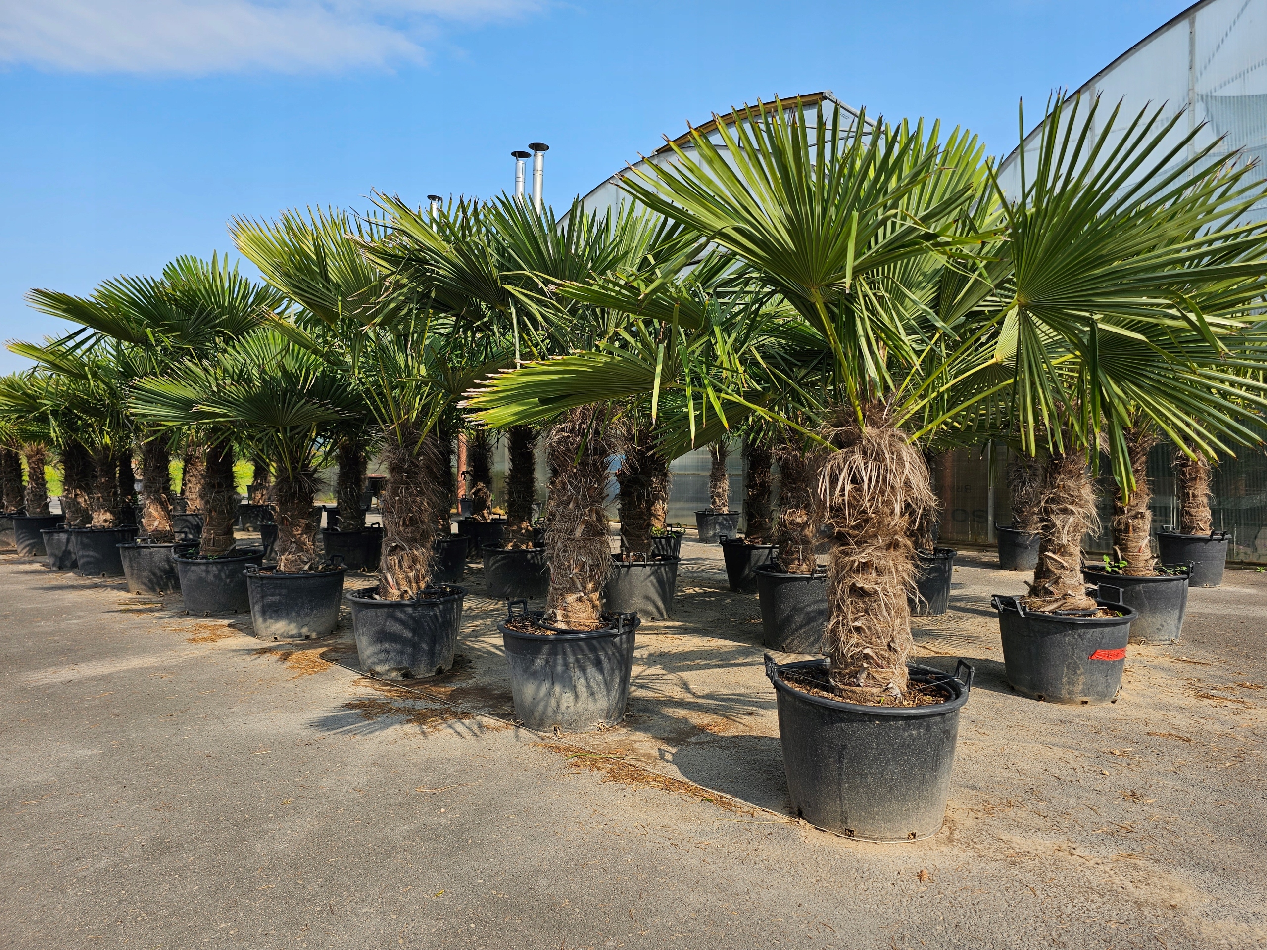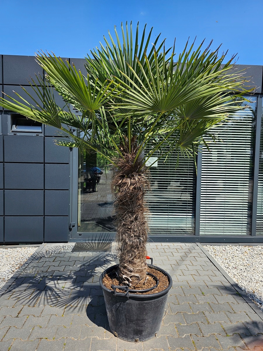 Предлагается — Trachycarpus Fortunei — одна из немногих пальм, пригодных для выращивания на открытом воздухе в нашем климате. При посадке в грунт выдерживает кратковременные заморозки до -16/17 градусов Цельсия, а также жару. При выращивании в горшках пальмы следует поддерживать при температуре не выше -6. Зимой при посадке в грунт он явно нуждается в зимней защите в виде греющего кабеля и нетканого материала. Укрываем пальму при температуре ниже -8 градусов по Цельсию. Подробную информацию наши клиенты получают на электронную почту о том, как правильно защитить растение. Очень важная информация: Trachycarpus Fortunei не является комнатной пальмой. Конечно, при определенных, удобных условиях ее можно зимовать в помещении, но мы не рекомендуем приобретать ее с расчетом на интерьер, так как это непросто. У этой пальмы кончики листьев естественно коричневые. Пальчики листьев обычно ломаются ветром, поэтому они приятно трепещут на ветру, что более слышно у более высоких экземпляров. Загнутые коричневые кончики листьев – не дефект, а неотъемлемая часть жизни Trachycarpus.