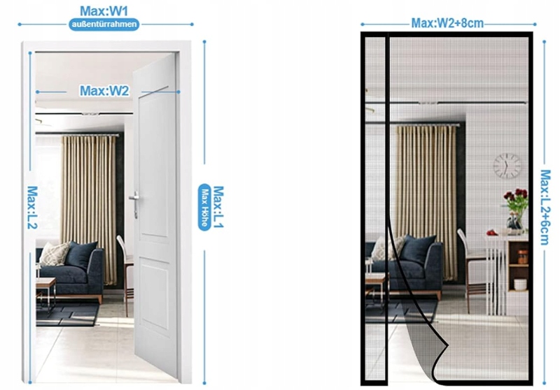 【Простая установка с помощью клея, дверная противомоскитная сетка без сверления】 Дверную противомоскитную сетку можно легко и быстро прикрепить или снять с помощью клейкой ленты (входит в комплект). Гвозди из комплекта поставки можно использовать для деревянных дверей. Перед покупкой измерьте размер вашей двери. Выбор размера: ширина москитной сетки ≥ (ширина внутренней рамы + примерно 6–8 см), длина москитной сетки ≥ (высота внутренней рамки + примерно 4–6 см).