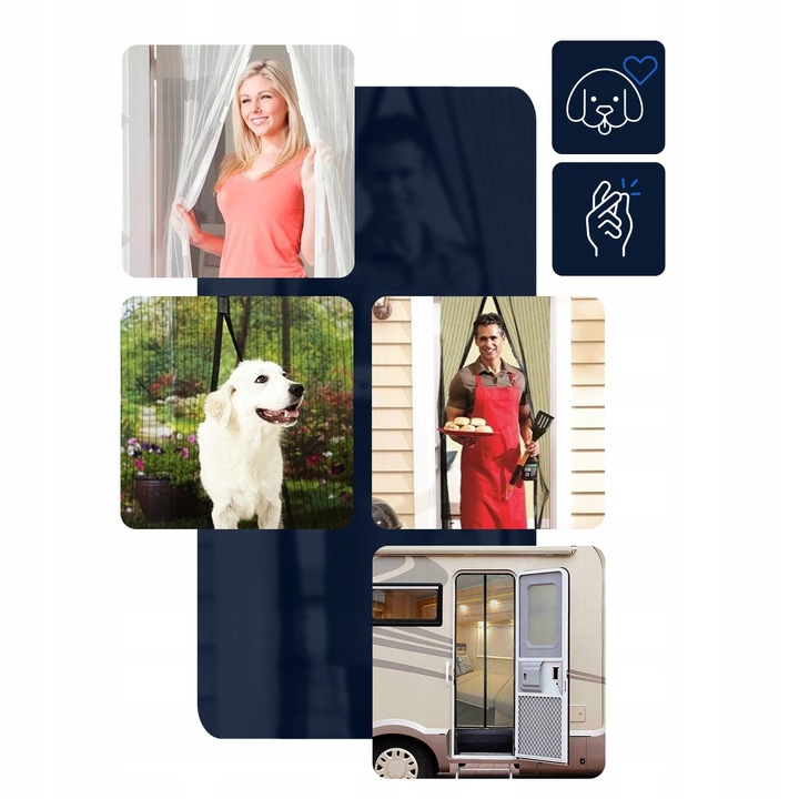 Он оснащен сильными магнитами, которые плотно соединяют две части москитной сетки, обеспечивая свободу использования нам и нашим домашним животным. Благодаря системе магнитов москитная сетка легко открывается при ходьбе и закрывается сама.