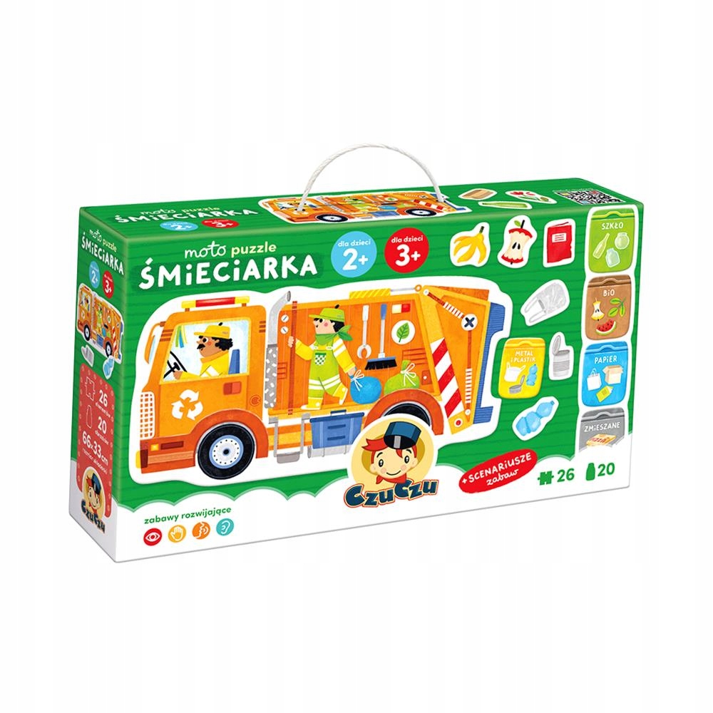 Впечатляющий, красочный и подробный пазл о мусоровозе состоит из 26 частей. К машине мы прикрепили 5 контейнеров и 15 элементов с различным мусором (по 3 на корзину) и игровые сценарии. Развивающий набор пазлов с аксессуарами — отличная идея для умного подарка для любознательного мира малышей и дошкольников.