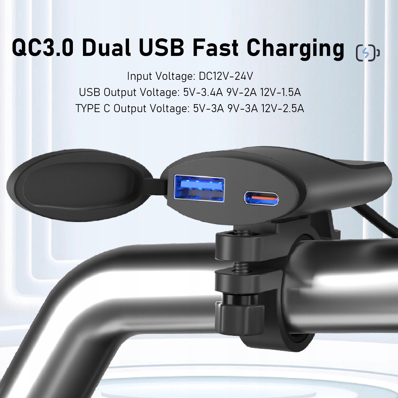 Как использовать: он может быть установлен на мотоциклах, квадроциклах, трех велосипедах и других автомобилях 12-24 V. Мотоциклетное зарядное устройство для двойного USB QC 3.0