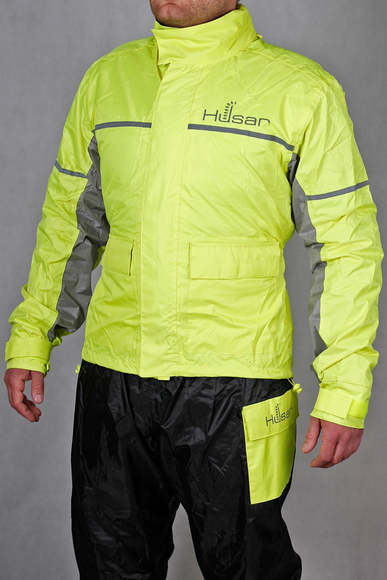 Комбинезон-дождевик-двойка с множеством светоотражающих вставок.