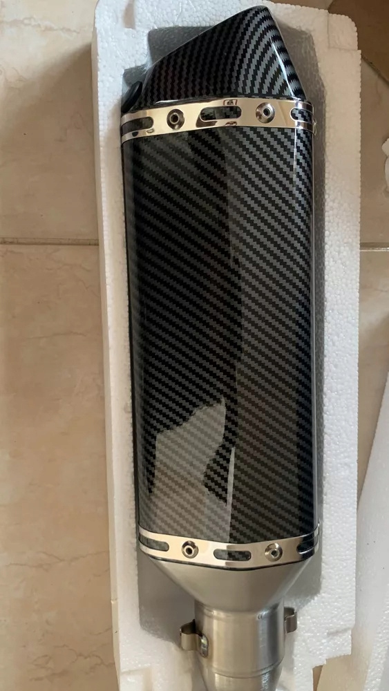 Наконечник глушителя покрыт гидрографическим рисунком, излучающим звук. ловля узора из углеродного волокна. Центральная часть окрашена в черный сатиновый цвет. Глушитель сделан очень добротно и точно