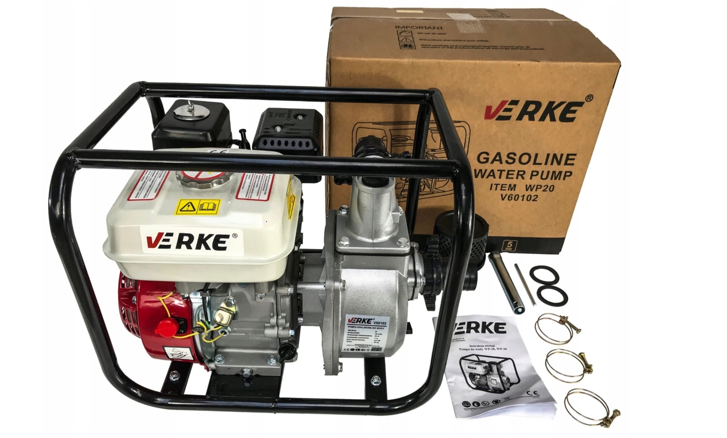 Эффективный насос внутреннего сгорания Verke имеет стальную раму, которая защищает его от повреждений и облегчает транспортировку. Идеально подходит для орошения, во время засухи и для любых работ, требующих перекачивания воды. Оснащен мощным четырехтактным двигателем мощностью 6,5 л.с.