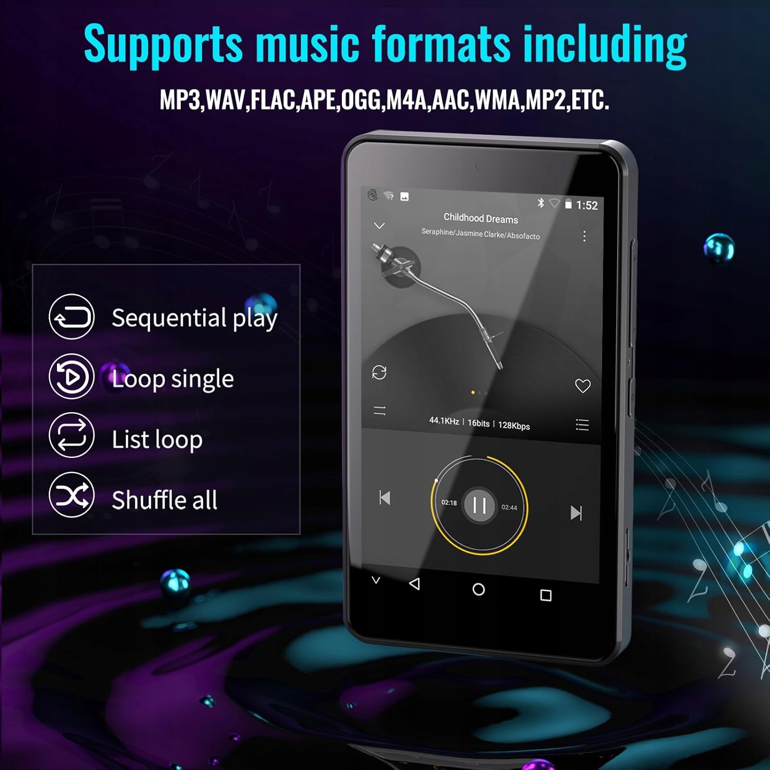 - Bluetooth и Wi-Fi: плеер оснащен Bluetooth и Wi-Fi, который совместим со многими Bluetooth такие устройства, как наушники и наушники, колонки, автомобильные стереосистемы, обеспечивают быстрое сопряжение и стабильное соединение через Bluetooth и Wi-Fi.