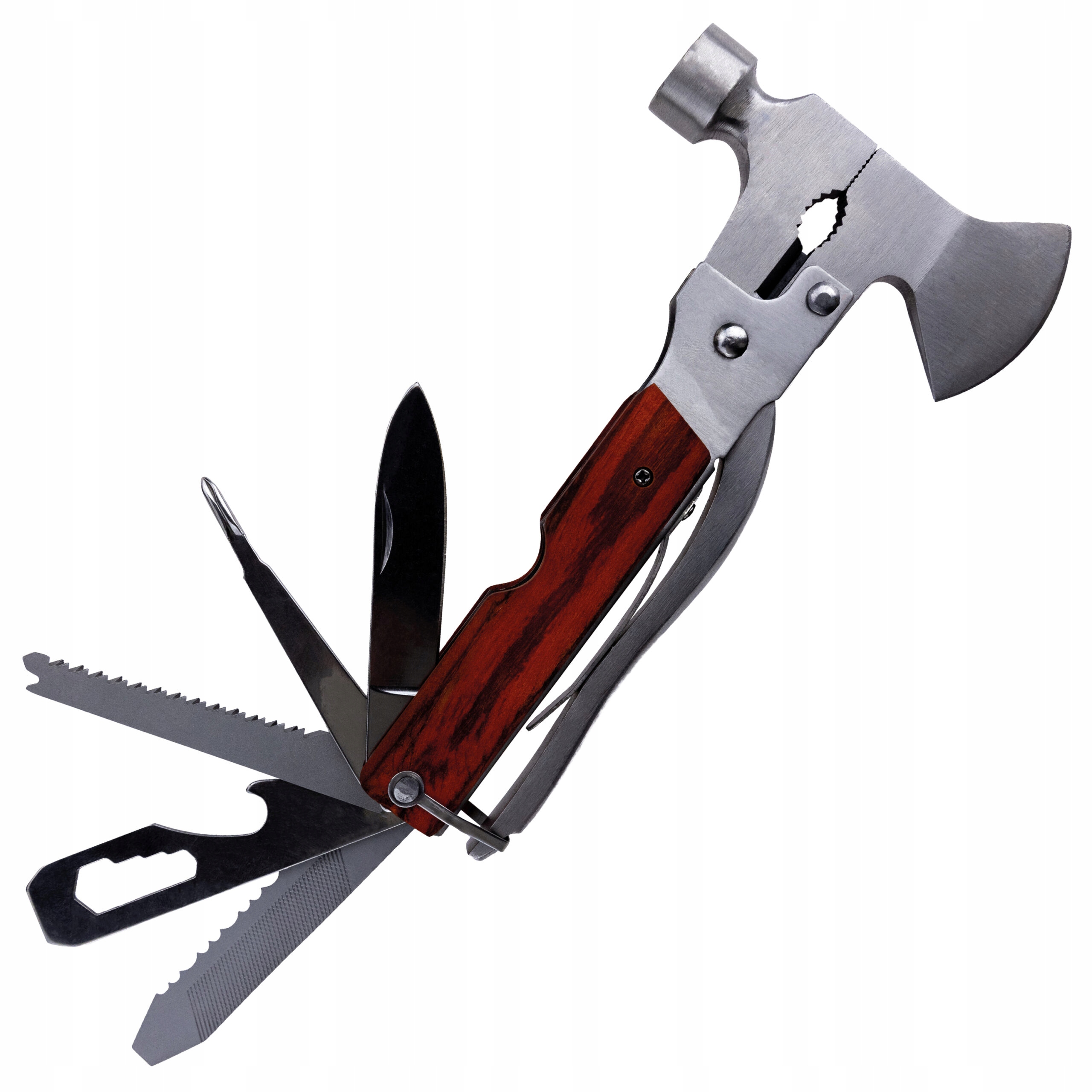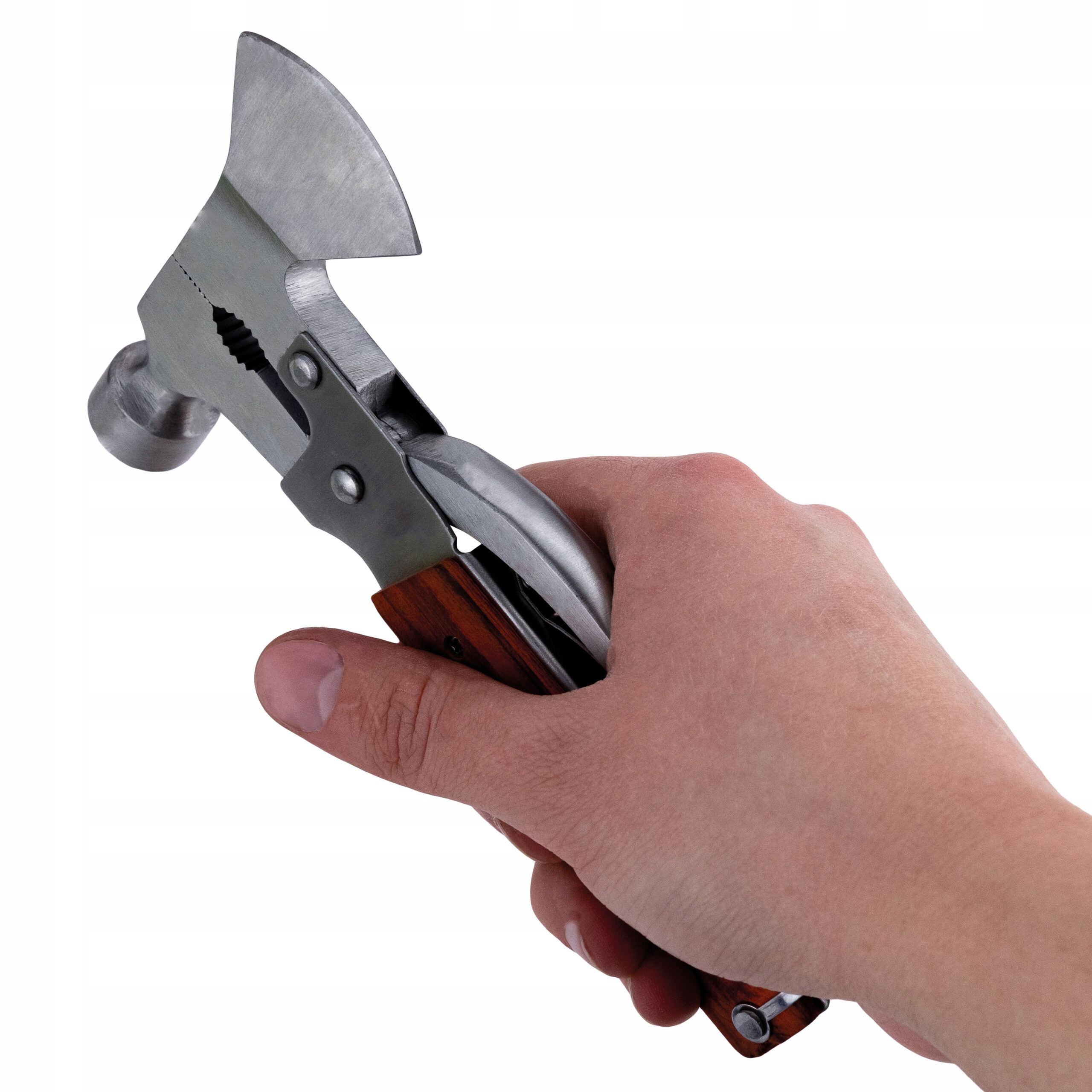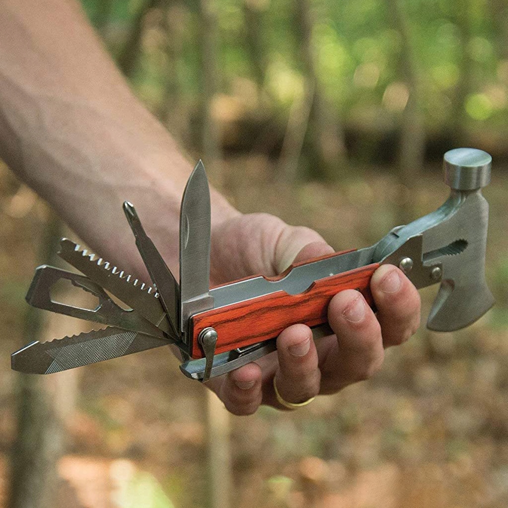 В комплект входит молоток с металлической головкой, которым можно забивать булавки. и крышки. Кроме того, в него входят пила, кусачки для веревок, нож, открывалка для бутылок, а также скребок и напильник. Каждая из этих функций может быть чрезвычайно полезна во время путешествия, альпинизма или работы в поле.