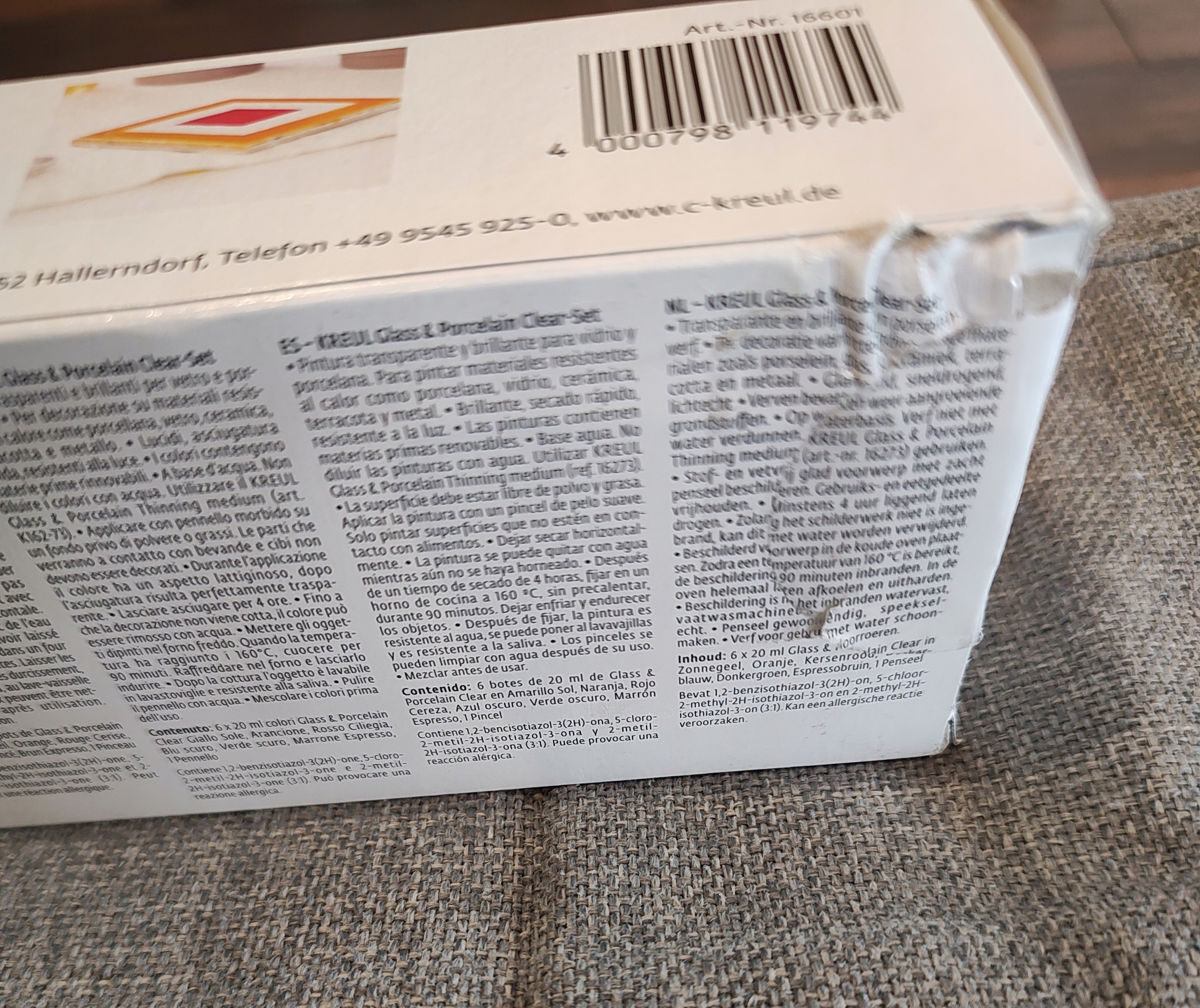 Набор фарфоровых фарфоровых красок. Для стекла и фарфора . Для рисования, устойчивых к высокотемпературным материалам, таким как: фарфор, стекло, керамика, терракота, металл. Полем Производится на основе минимум 60% возобновляемых материалов естественного происхождения. Хотя это краски на основе воды, их не следует разбавлять водой. Среднее стекло и фарфоровое истончение среды Kreul. Поверхность должна быть свободна от жира и пыли. Нанесите краску мягкой щеткой щетины. Не используйте на поверхностях, которые находятся в контакте с едой. До фиксации краска можно удалить водой. Сухое время - 4 часа. Чтобы починить его в холодной духовке, установите температуру на 160 градусов C и после нагревания в течение 90 минут. Оставьте остыть. После фиксации мотив устойчив к воде и слюне, окрашенные объекты могут быть промыты в посудомоечной машине. Очистите кисти водой сразу после работы. Набор включает в себя 6 банок с способностью 20 мл