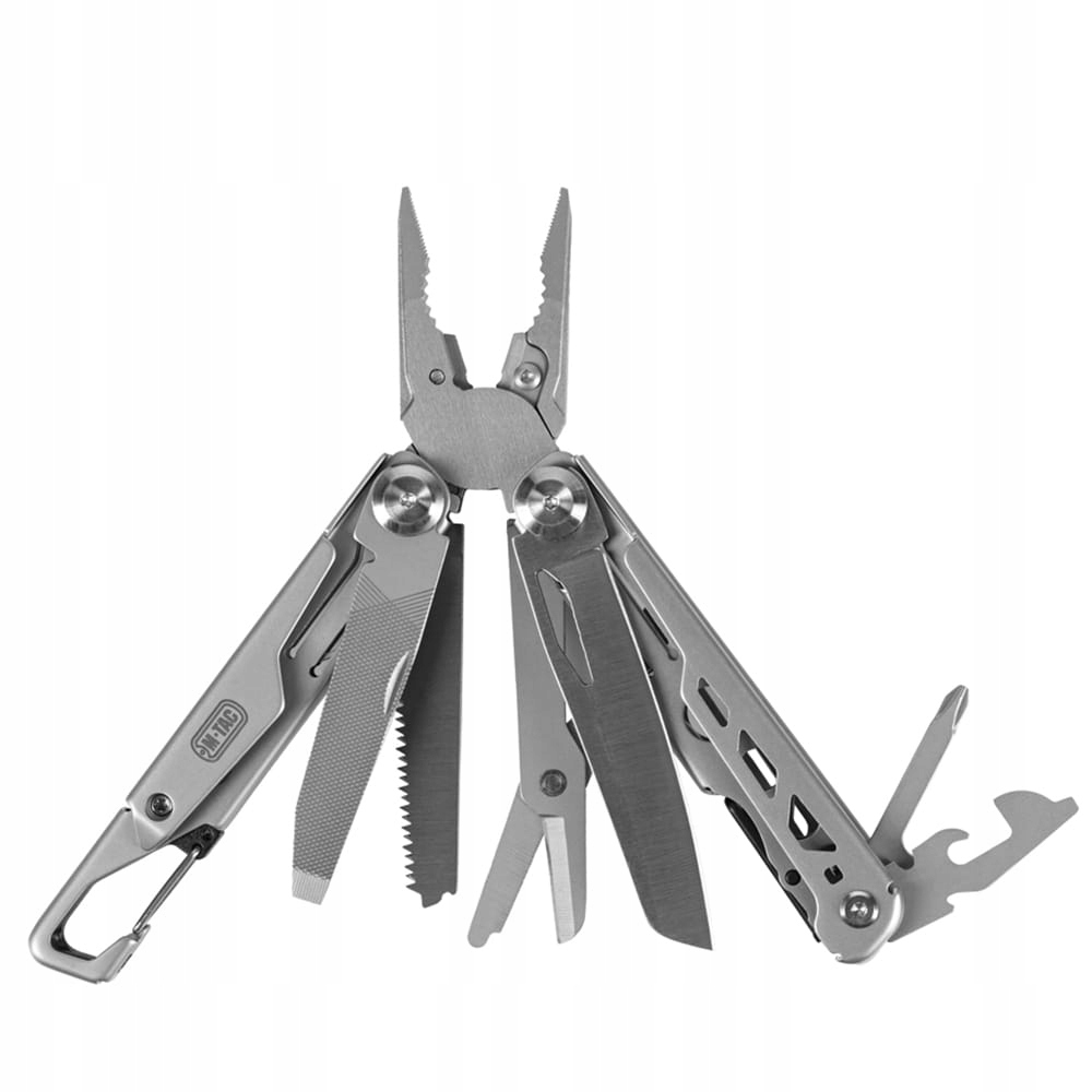 В мультитуле много полезных инструментов: плоскогубцы и кусачки, нож, ножницы, крестовая отвертка и две плоские отвертки (маленькая и большая), консервный нож, консервный нож, резак для ремня и шило. Все элементы плотно фиксируются в открытом и закрытом положении. Благодаря эргономичной форме мультитул идеально лежит в руке и не выскальзывает во время использования.