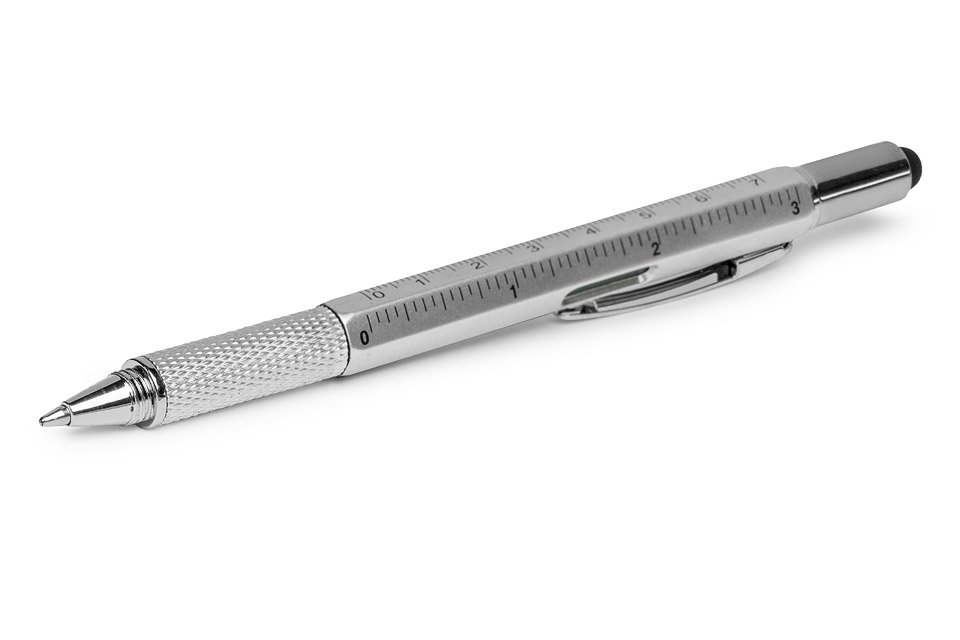Универсальная ручка хорошо сработает во многих ситуациях и позволит вам выйти невредимым. Зачем нужна ручка, которая только пишет, если у вас есть ручка, которая может использоваться несколько раз и имеет гораздо большие возможности. Помимо функции письма, нашу ручку можно использовать как так называемую ручку. стилусом, потому что у него есть резиновый наконечник для сенсорных экранов. После его откручивания можно использовать кончик отвертки, плоский с одной стороны и крестообразный с другой. На корпусе ручки имеется линейка в сантиметрах и дюймах (7 см и 3 дюйма) и мини-уровень.