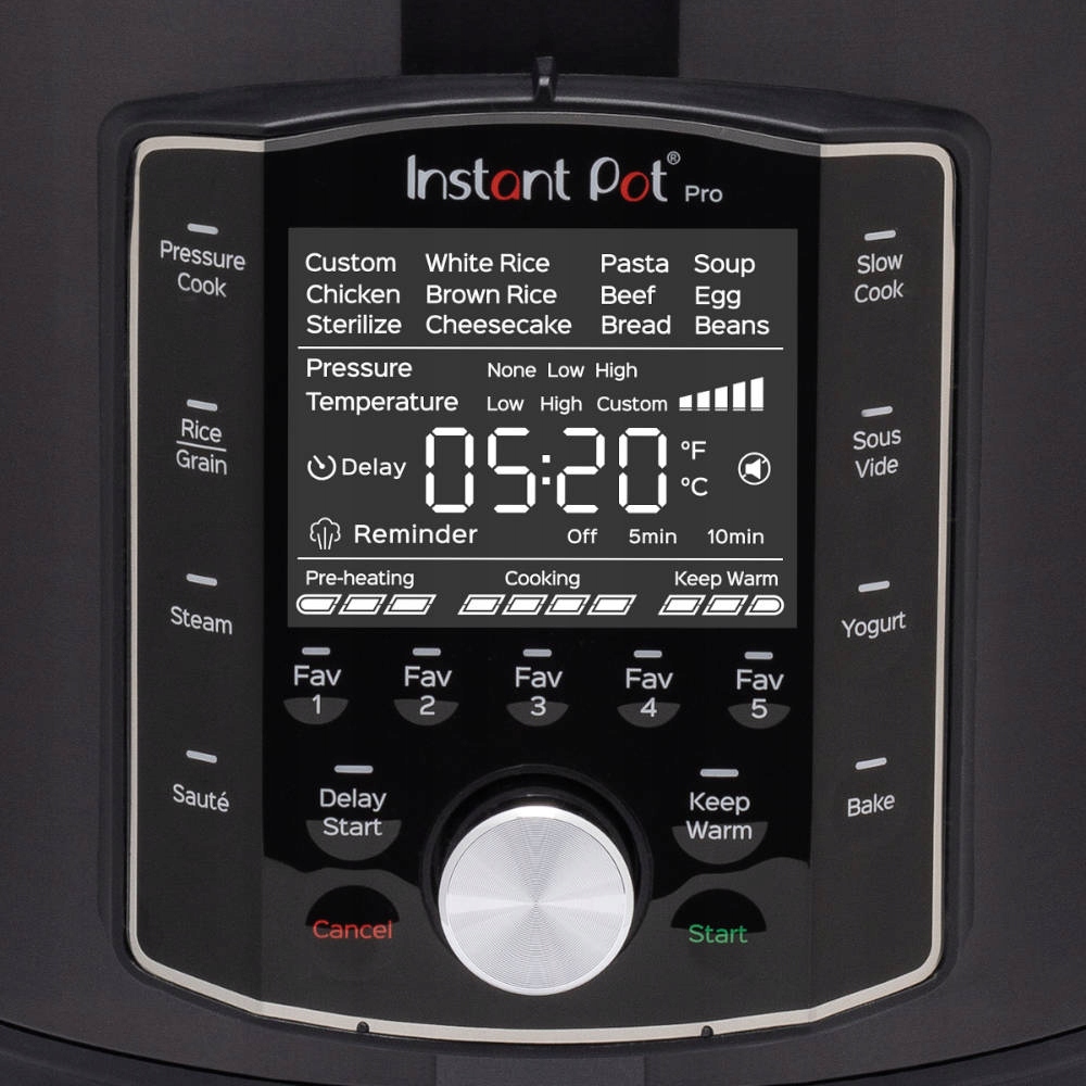 Прибор Instant Pot® Pro™ 10 в 1 сочетает в себе возможности множества различных устройств и, помимо приготовления под давлением, позволяет: готовить как в мультиварке, методом Суви (Sous Vide), жарить (Souté). , специализированная варка риса/круп, стерилизация, приготовление йогурта, разогрев, выпечка лепешек и приготовление на пару.
