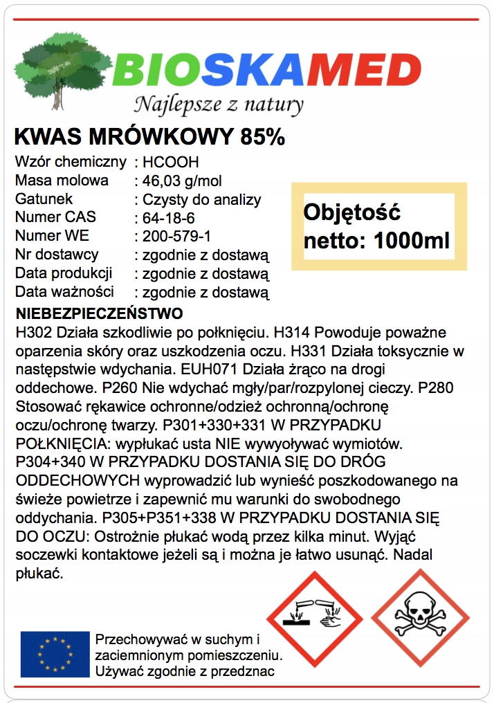 Просматривая «Муравьиная кислота 85% Чистая для анализа 1 литр», вы можете быть уверены, что данный товар из каталога «Кислоты» будет доставлен из Польши и проверен на целостность. В цене товара, указанной на сайте, учтена доставка из Польши. Внимание!!! Товары для Евросоюза, согласно законодательству стран Евросоюза, могут отличаться упаковкой или наполнением.