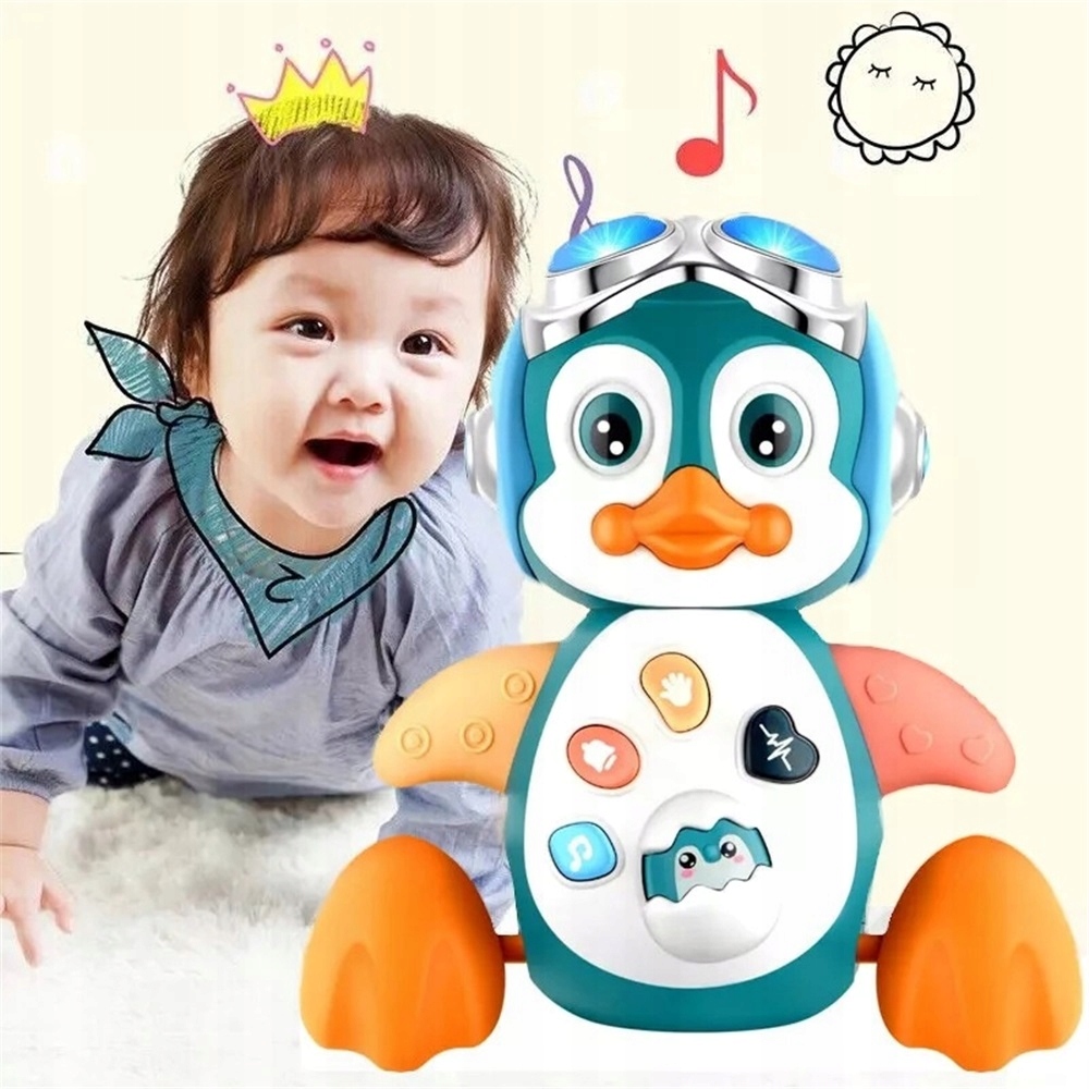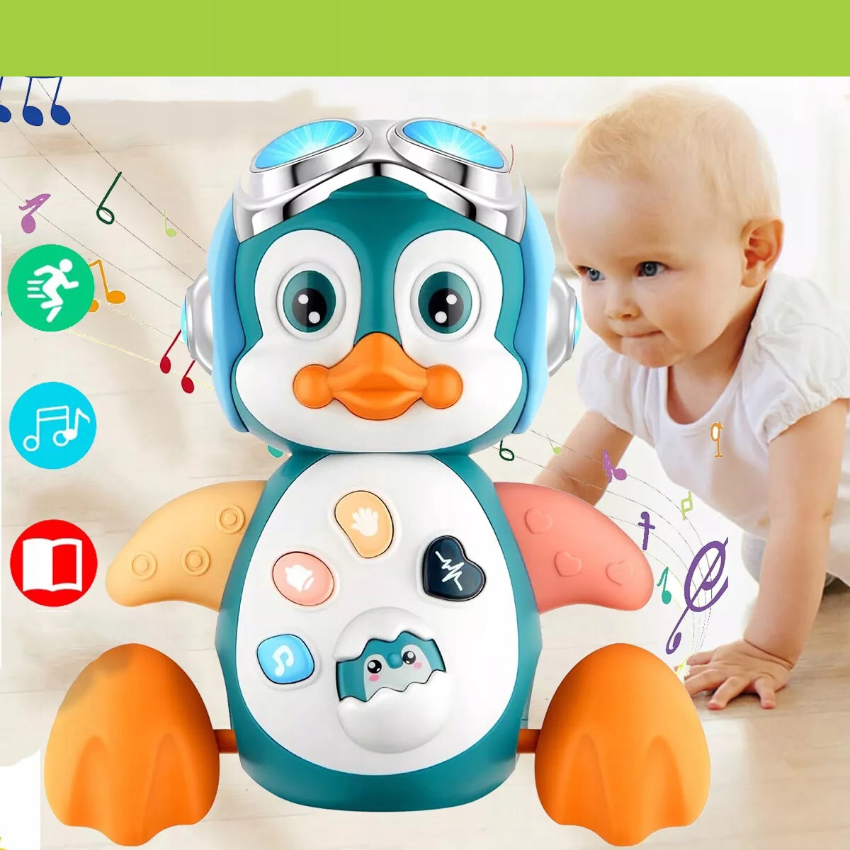 В игровом режиме пингвин движется, играет музыку и мигает светом, побуждая детей преследовать его. Это веселое взаимодействие развивает контроль мышц, баланс и открывает путь к ходьбе, делая развитие радостным.