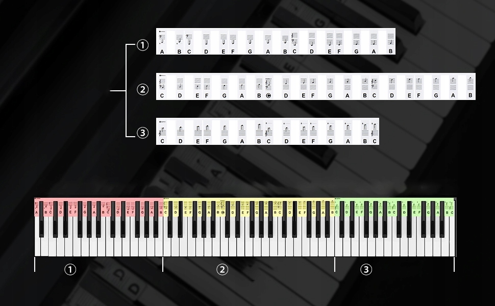 【Изготовлено из силикона высочайшего качества】Съемные этикетки для нот на клавиатуре фортепиано изготовлены из силикона и соединяются последовательно, поэтому вам не придется приклеивать их к клавишам, как наклейки на фортепиано.
