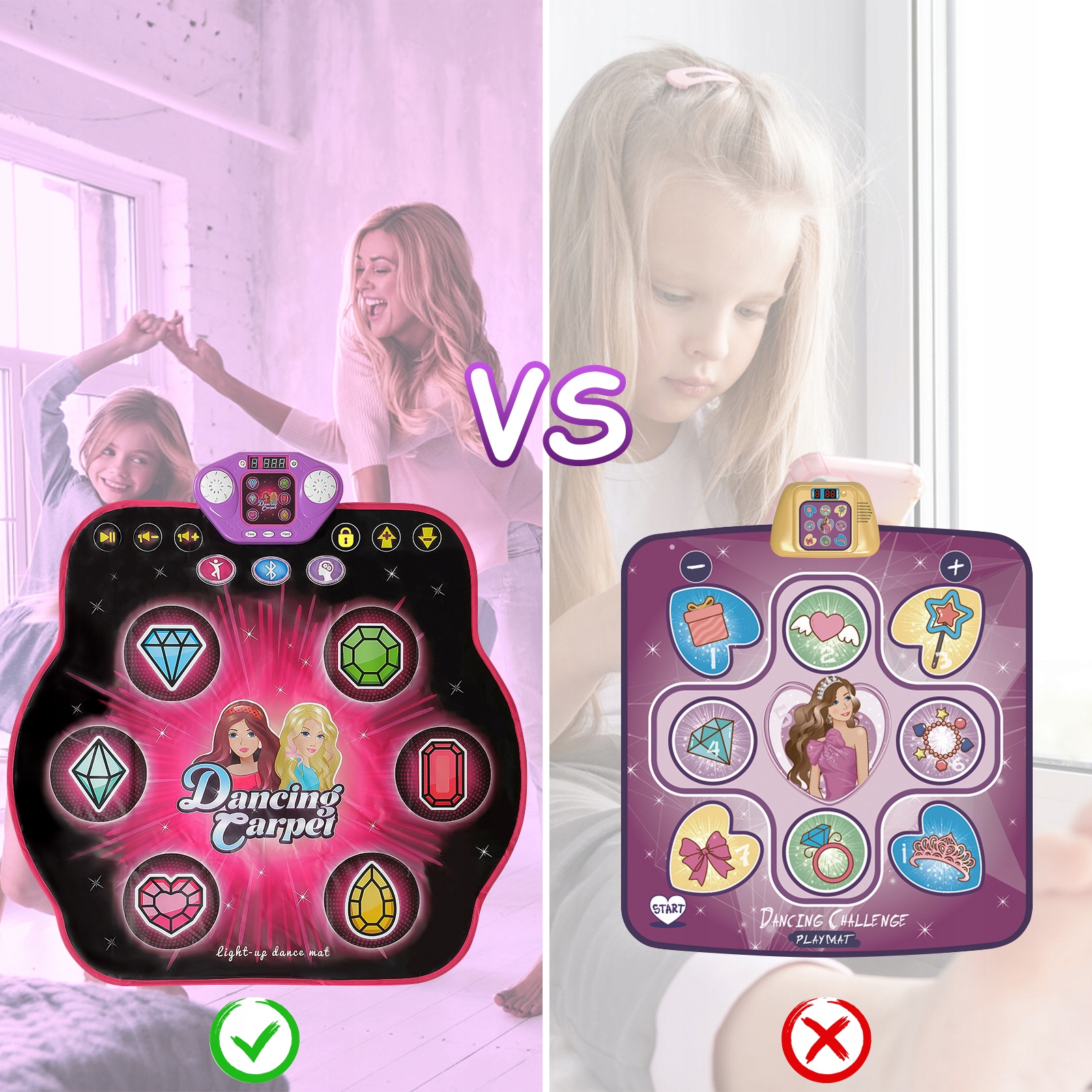 - ⭐ВАРИАНТЫ РАЗВЛЕЧЕНИЯ. Танцевальный коврик с подсветкой для девочек предлагает ряд функций, которые развлекут детей, включая 27 уровней сложности и 5 игровых режимов (произвольный танец) | вызов с 4 кнопками | вызов с 6 кнопками | режим Bluetooth | режим памяти). Дети могут выбирать из множества задач и танцевальных стилей.