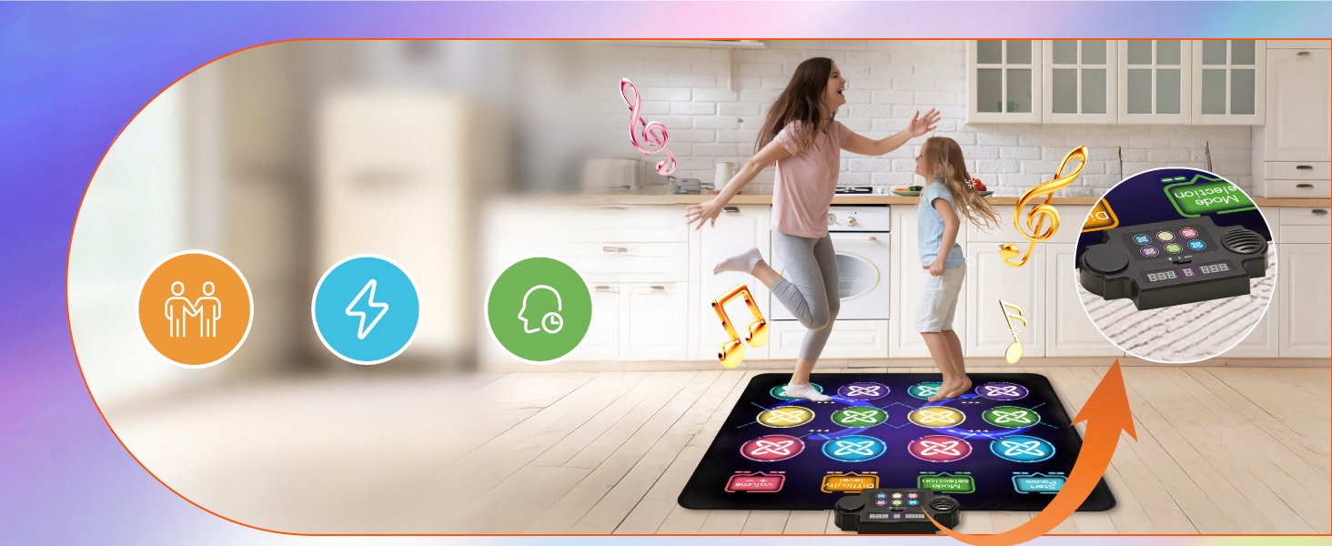 , изготовленный из высококачественного, экологически чистого материала из ПВХ, двойной танцевальный коврик гарантирует на 100% безопасность для чувствительной кожи детей и забавных движений. У него есть два захватывающих способа для индивидуального обучения конкуренции - этот коврик способствует командной работе и здоровой связи между братьями и сестрами/друзьями.