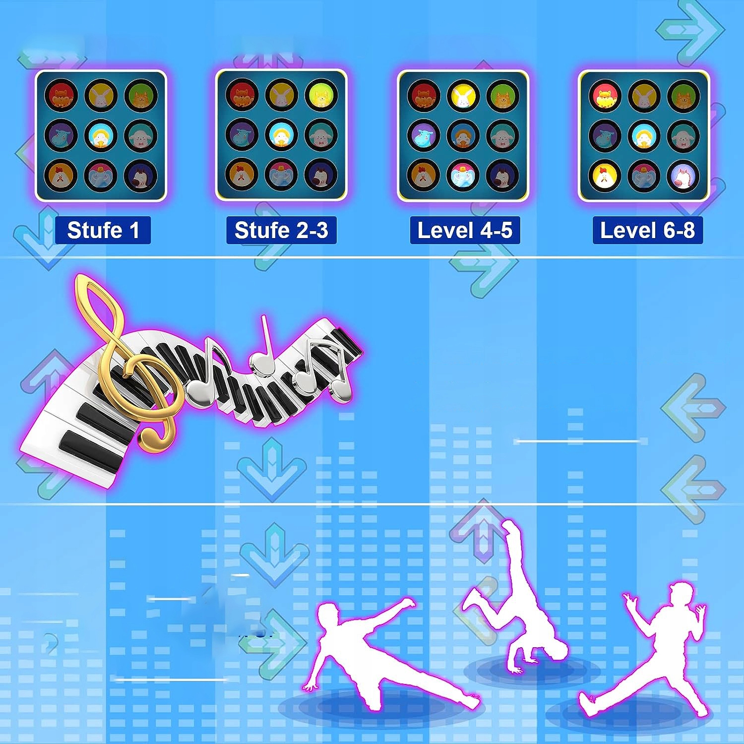 - Музыкальный коврик для детей, танцевальный коврик имеет 8 встроенных музыкальных произведений, 4 режима игры, 8 уровней, 3 уровня сложности, регулируемую громкость.