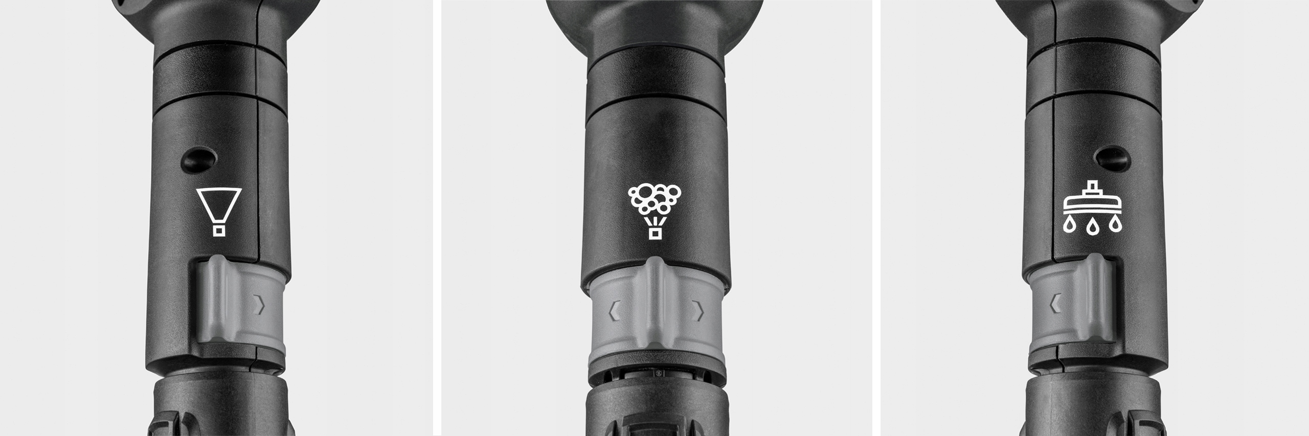 Нанесение пены, удаление стойких пятен грязи с помощью плоской струи высокого давления или работы мягкой кистью – все это возможно без необходимости смены аксессуаров. Нужная функция выбирается с помощью рычага в области держателя щеток.