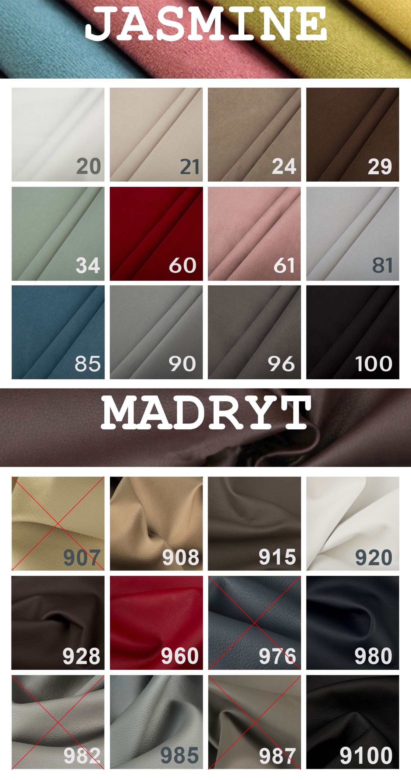 - МАДРИД (экокожа) ткань армирована снизу белым и серым плотным трикотажем. Трикотаж доступен только в экокоже LUX. Рисунок среднего тиснения с четкой структурой кожи. Финиш кожаного покрытия слегка матовый.