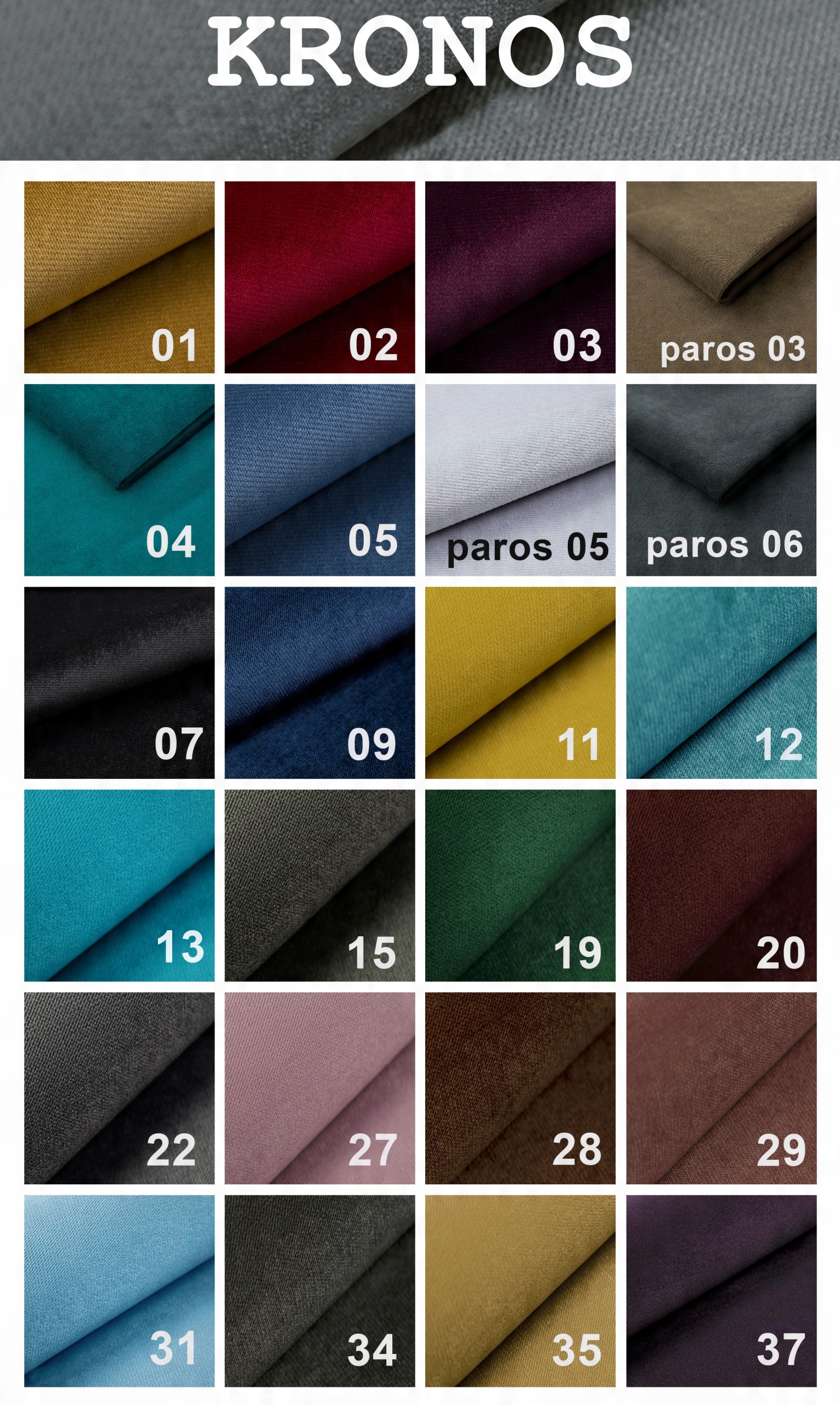 - KRONOS (плюш) Ткань KRONOS – прочная, очень плотная, плетеная ткань с эффектом деликатного переливов и растушевки при помощи куча. Благодаря высокой устойчивости к выцветанию ткань прекрасно подходит для обивки мягкой мебели.