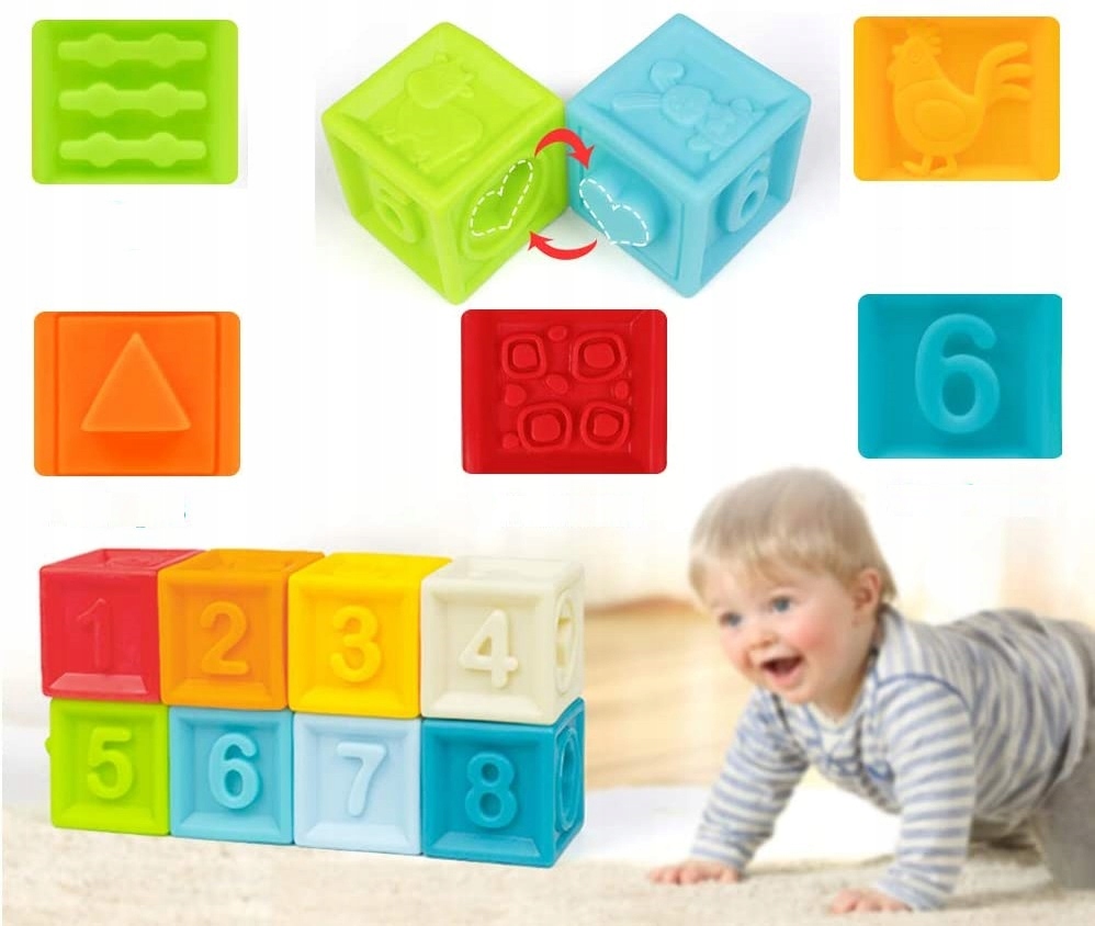 Каждый из блоков имеет выпуклость числа, геометрические фигуры, фигуры, животные, фрукты и картинки. Каждый шар имеет разный цвет, форму, размер и текстуру. 4 разных животных. Это влияет на развитие чувств и осязаний. Мы можем соединить блоки вместе. Благодаря своей структуре они идеально подходят в качестве прорезывателей для младенцев. При нажатии - скрипят. С ними можно играть в воде. Развивают зрительную и слуховую координацию и моторику ребенка.