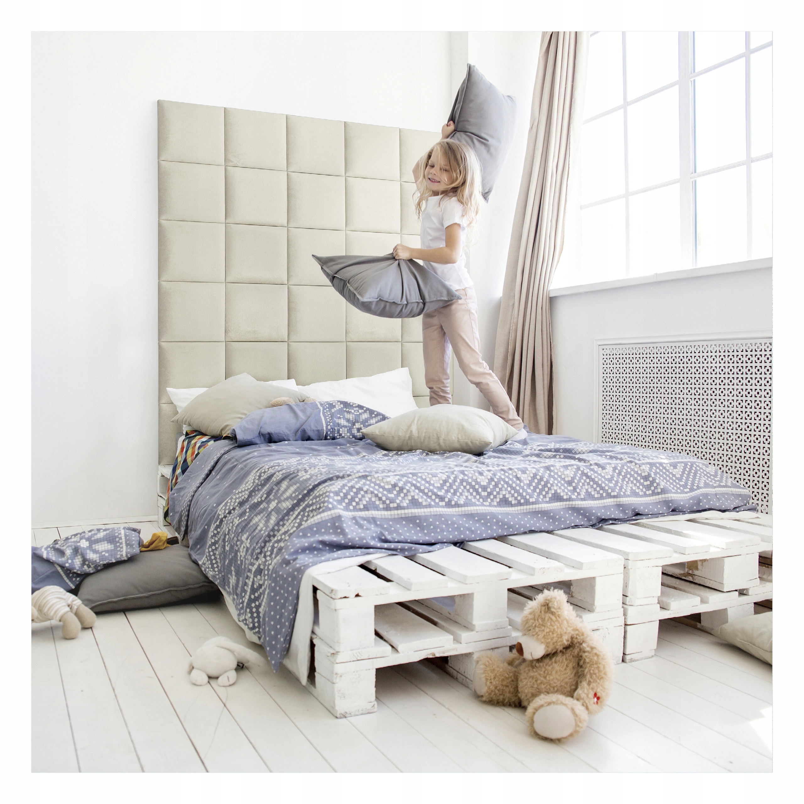 Квадратная серия панелей с мягкой обивкой обеспечивает звукоизоляцию. Более того, использование панелей на изголовье отделяет кровать от влияния холодной стены. Толщина панели 3,7 см.
