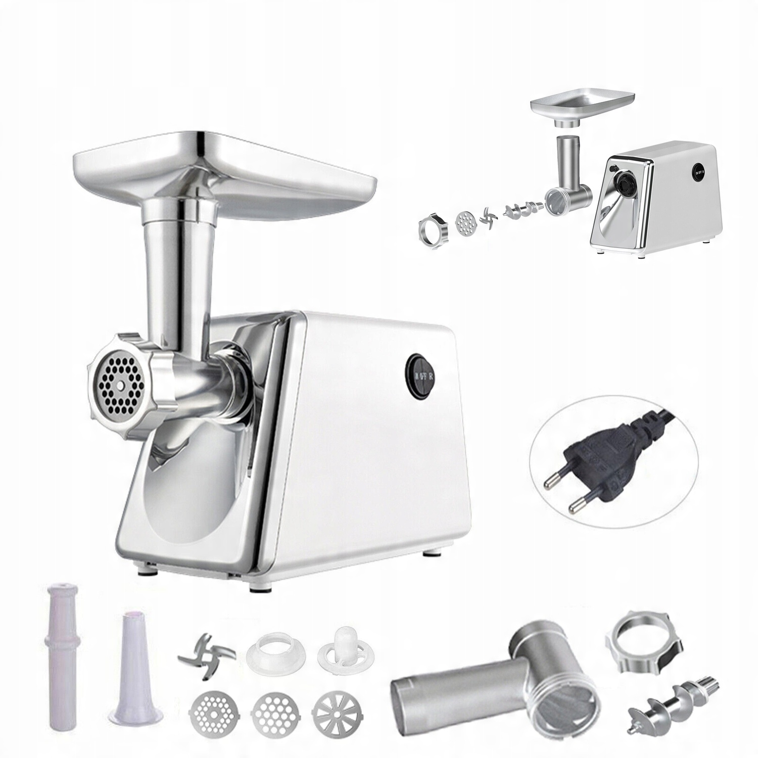 ➡ емкость и различные вложения h2> - Устройство имеет 3 перфорированных щита, толстых, средних и маленьких, благодаря тому, что у вас есть все варианты на выбор, будь то небольшое шлифование для колбасы, среднее измельчение для восхитительного соуса болоньезе или толстого шлифования для жаркого. Без необходимости постоянно дополнять мясо из режущей доски.
