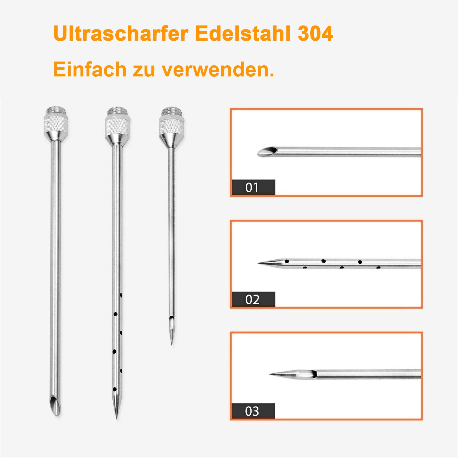 【3 типа игл и мариновая щетка】 две иглы 14-14,5 см и одна игла 11 см для различных применений. Игла с 12 отверстиями обеспечивает ровную инъекцию жидкого маринада. Вторая 14-сантиметровая игла с большим отверстием на конце подходит для более толстого маринада (например, более толстый перец, растворенная паста барбекю, более мелкие кусочки, такие как травы). Также доступно 11-сантиметр, которая может быть использована для введения жидкого маринада в тонкие ломтики, такие как стейки и шашлыки