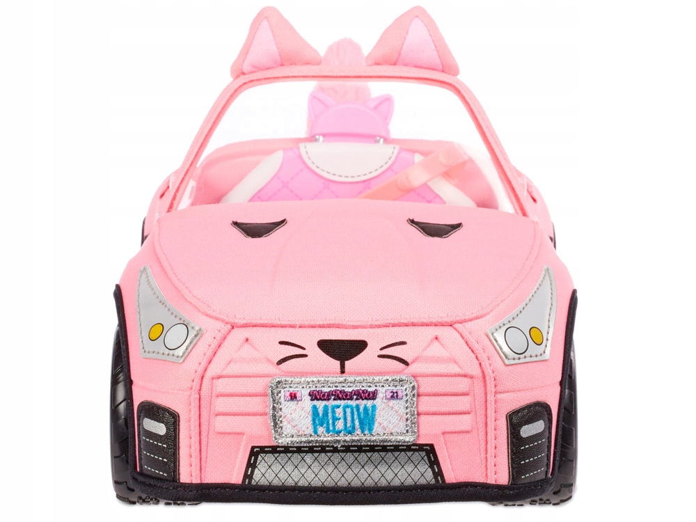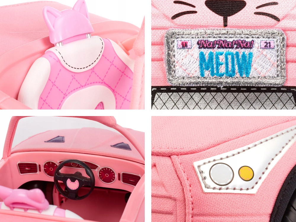 Лобовое стекло украшено кошачьими ушками, а задний бампер украшен пушистым розовым хвостом. Кошачий декор также присутствует на сиденье, руле и ремнях безопасности.