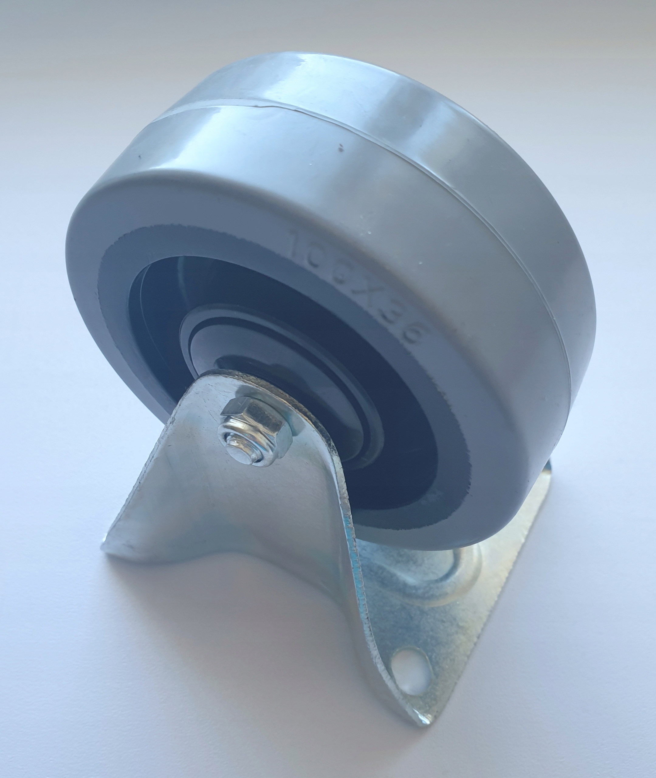 Гибкая серая РЕЗИНОВАЯ сплошная шина, не оставляющая следов, ступица из черного полиамида, одинарный шариковый подшипник с шапками. Качество прокатки колес отличное. Шина поглощает неровности.