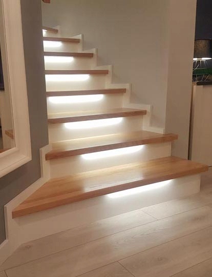 - Световую полосу можно монтировать накладно. Это значит, что мы прикрепляем ее к поверхности лестницы с помощью кронштейнов или скотча.
