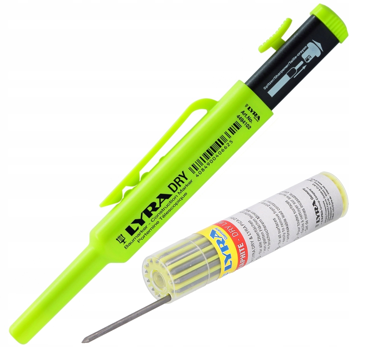 Lyra Dry Profi — простой маркер, который помогает во всех строительных, столярных, монтажных и обустройство дома работах. Карандаш оснащен механизмом заправки, что позволяет легко пользоваться им даже одной рукой. Этот маркер также имеет встроенную точилку, расположенную в кобуре. Компания LYRA оснастила модель DRY PROFI аккуратной кобурой с клипсой, которую можно прикрепить к брюкам или ремню.
