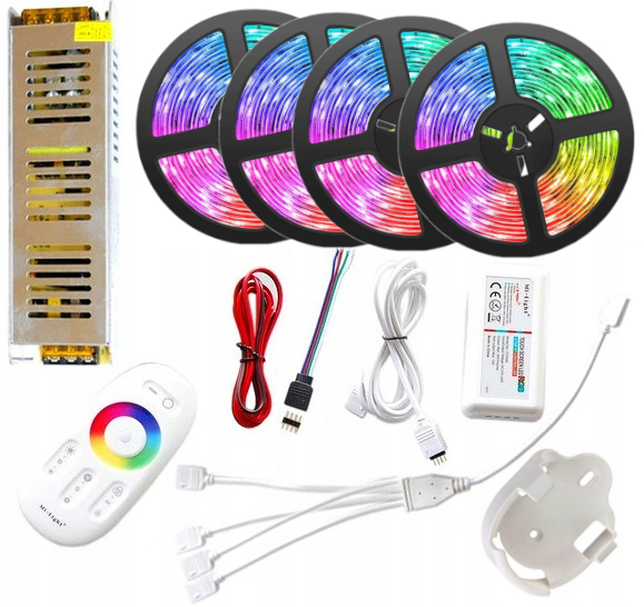 - 20 м RGB светодиодных лент (4 рулона) длиной 5 м с разъемами на концах, что значительно упрощает подключение)