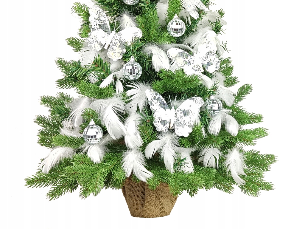 перья в снежном цвете вплетены во все дерево, дополненные красивыми бабочками.