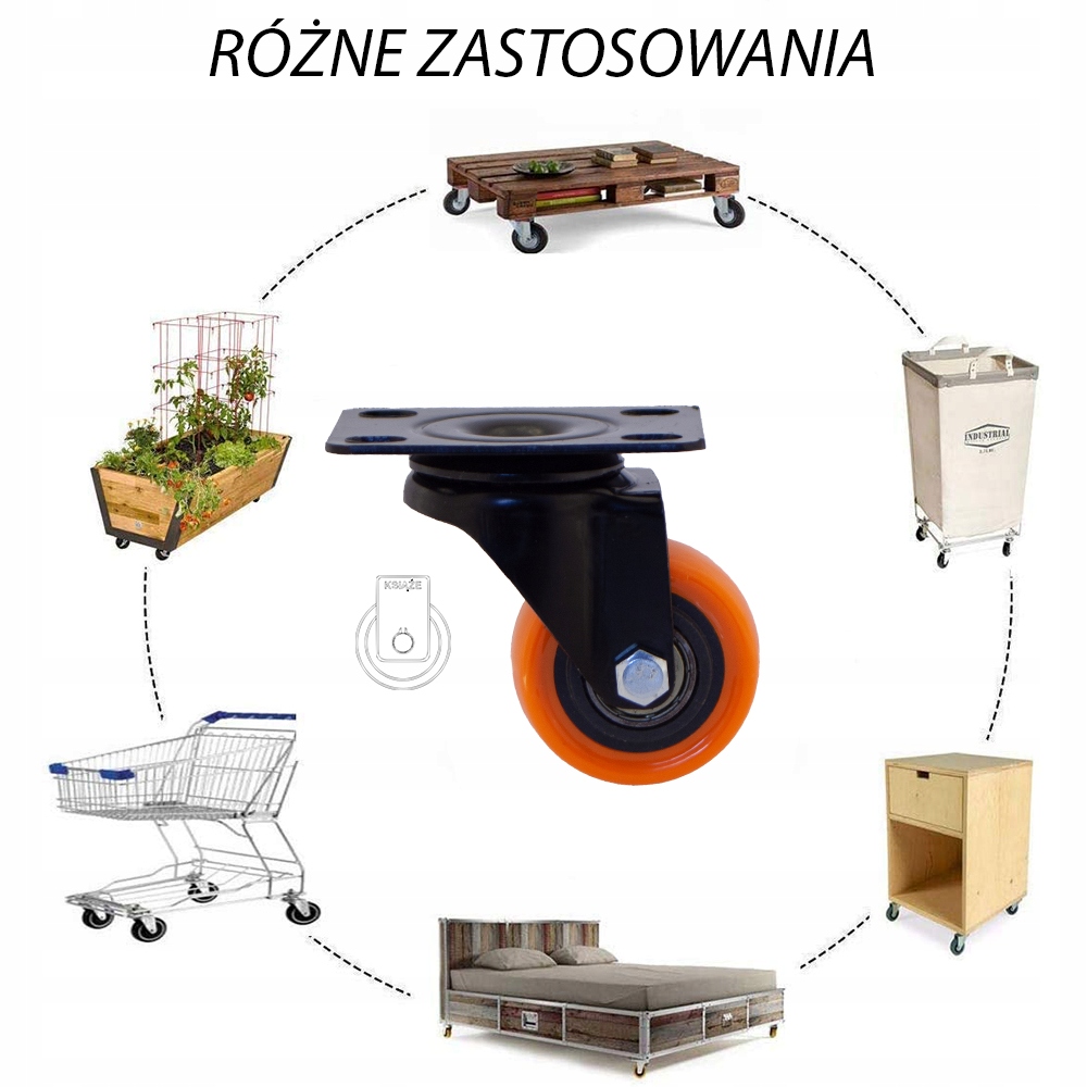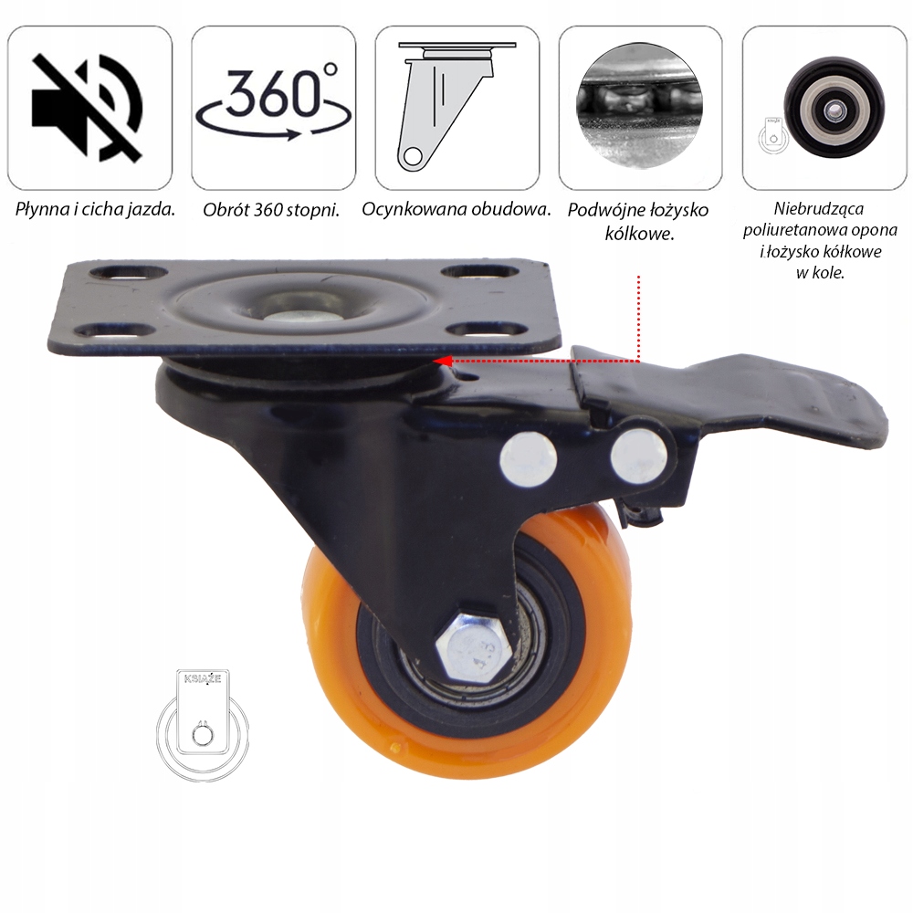 - КОЛЕСО состоит из полипропиленовой ступицы и немаркирующей полиуретановой шины, имеет двойной шарикоподшипник. Колеса имеют прочность 70 кг на колесо. Они медленно изнашиваются, устойчивы к повреждениям, поглощают удары и вибрации. Они вращаются на 360 градусов, облегчая маневрирование мебели или коляски. Они плавно вращаются на твердых и гладких поверхностях, таких как бетон, с минимальным трением.