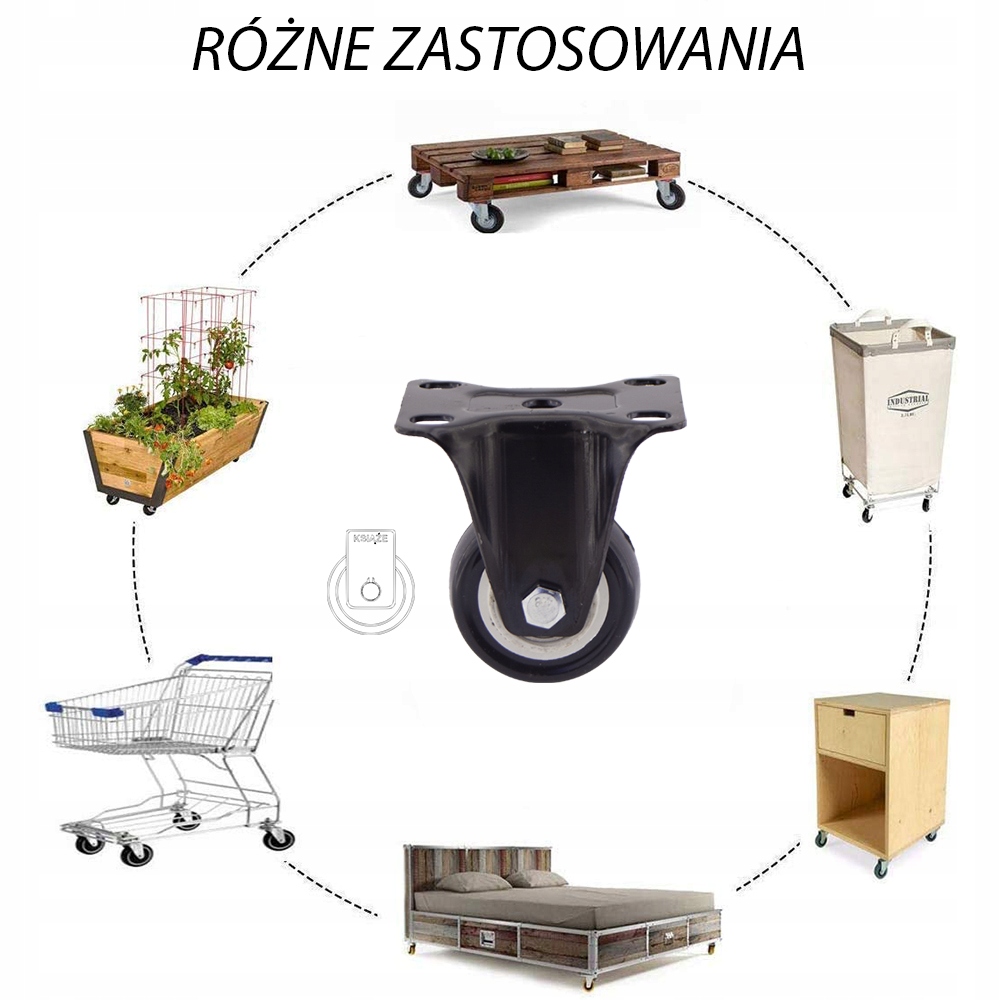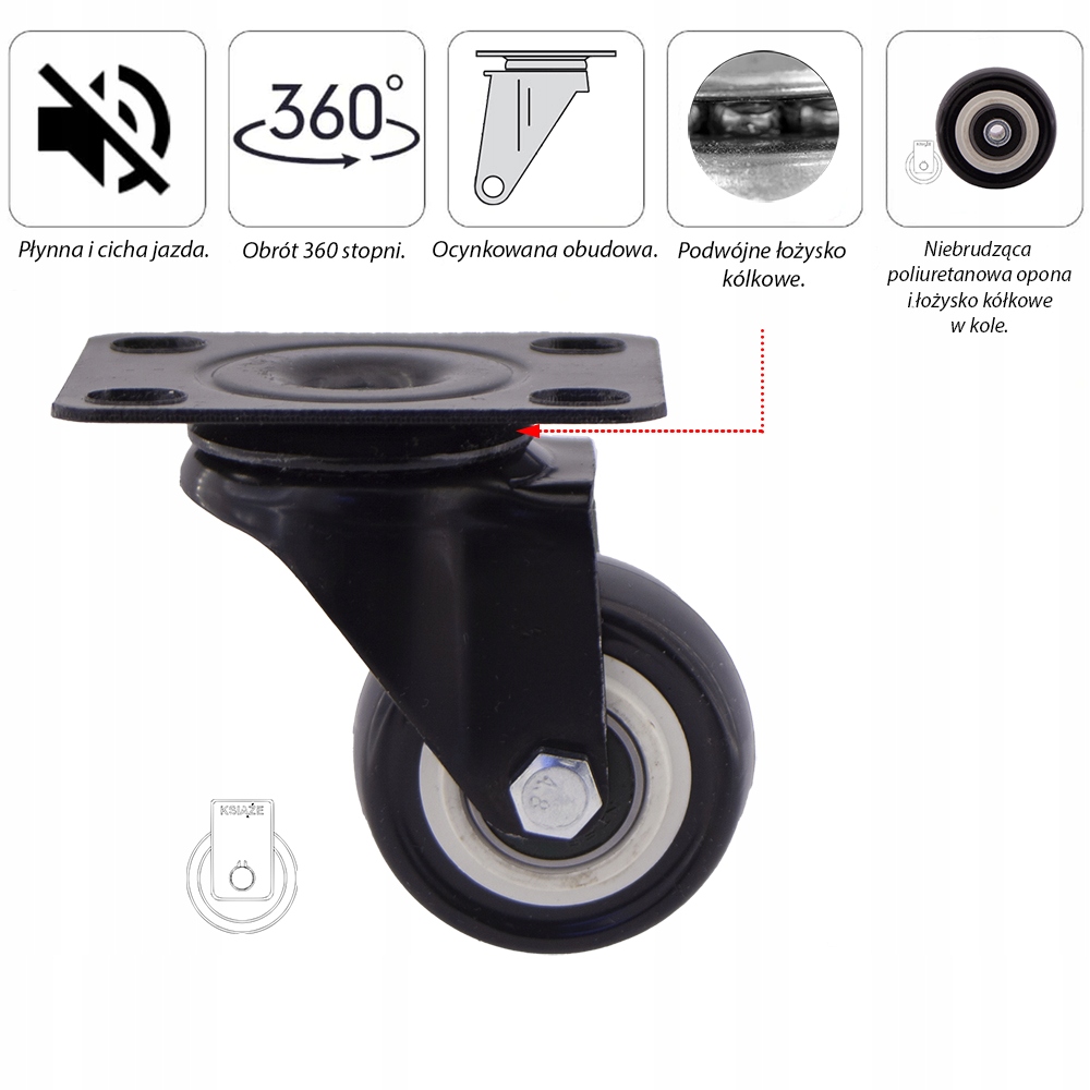 - КОЛЕСО состоит из полипропиленовой ступицы и немаркирующей полиуретановой шины, имеет двойной шарикоподшипник. Колеса имеют прочность 70 кг на колесо. Они медленно изнашиваются, устойчивы к повреждениям, поглощают удары и вибрации. Они вращаются на 360 градусов, облегчая маневрирование мебели или коляски. Они плавно вращаются на твердых и гладких поверхностях, таких как бетон, с минимальным трением.
