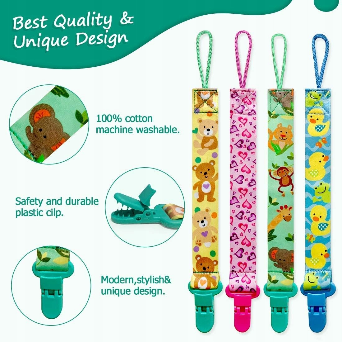 - Пластиковые зажимы Не содержат BPA; Безопасно для зубов ребенка, если он их грызет.