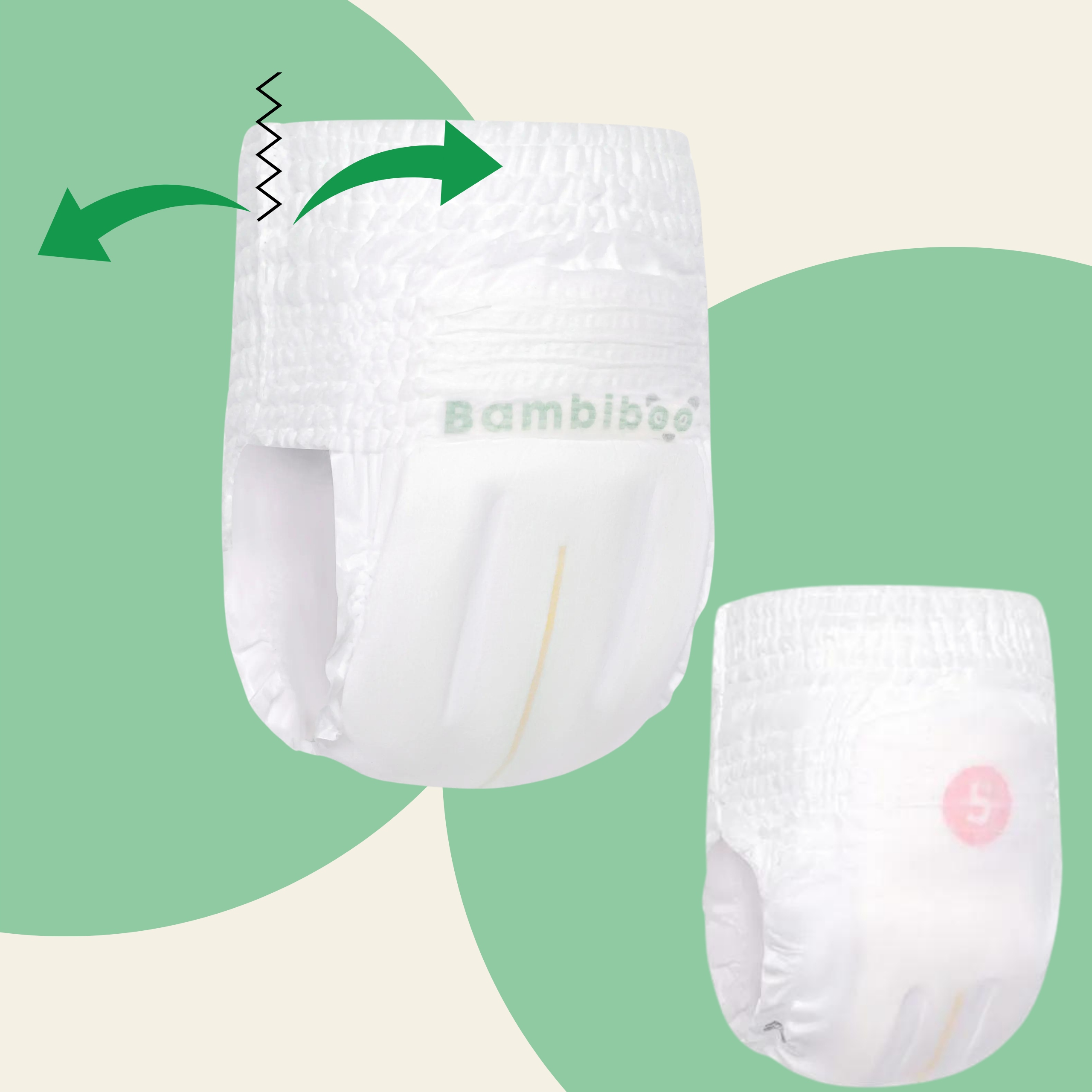 Одноразовые подгузники размера 5 предназначены для детей двухлетнего возраста. Они идеально подходят для детей, которые не только гуляют, но и смело бегают. Тогда им нужны подгузники, которые будут гибкими и не ограничивают движений, и именно такими являются наши штаны для юниоров. Они обеспечивают детям максимальный комфорт и легко снимаются, что полезно при смене подгузников или при первом использовании горшка. Подгузники Bambiboo обогащены органическим хлопком, который безопасен для чувствительной кожи ребенка. Они воздухопроницаемы и быстро впитывают жидкость, поэтому дно остается сухим. Имеют специальные оборки, которые в свернутом виде обеспечивают герметичность и предохраняют одежду от намокания.