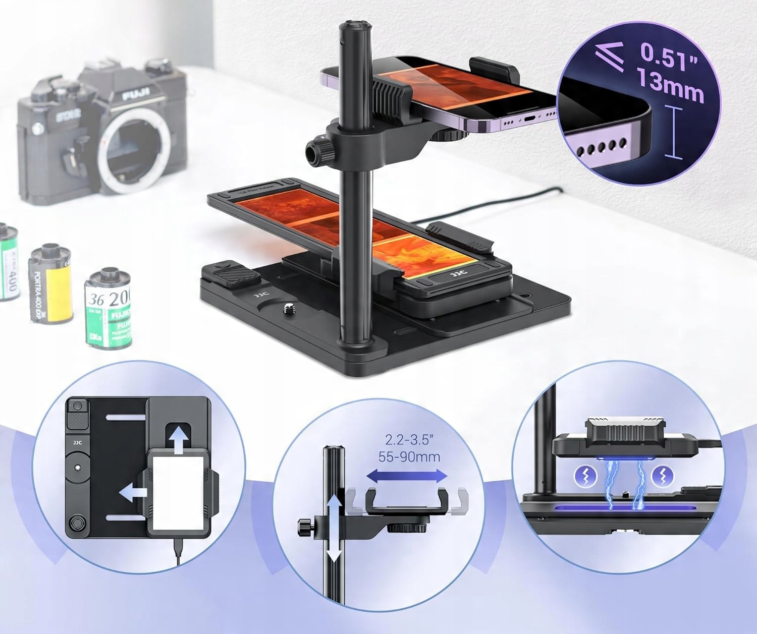 【Широкая совместимость】Набор работает как с пленками шириной 35 мм, так и с 120 мм. Поместите пленку в держатель, затем вставьте ее в панель подсветки. Подпружиненный держатель телефона (для смартфонов шириной от 2,2 до 3,5 дюймов/55-90 мм) удобен и легко регулируется для быстрого захвата и отстегивания. Держатель телефона также позволяет регулировать вертикальную регулировку стержня в соответствии с различными фокусными расстояниями смартфонов. .